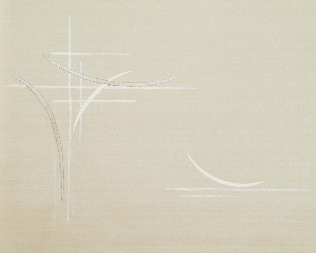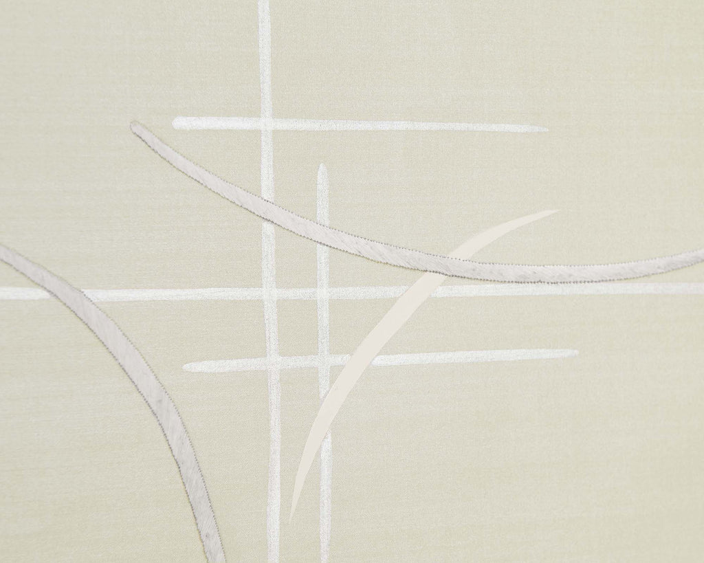 Embroidered geometry and metallic brushwork echo the kinetic energy of early modernist sculpture.