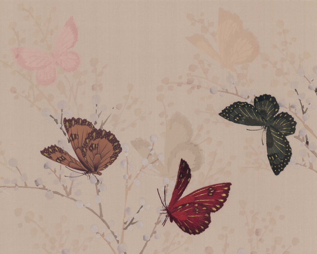 Delicate sprays of mimosa frame embroidered butterflies, blending Chinese freehand painting with the elegance of the European aesthetic movement.