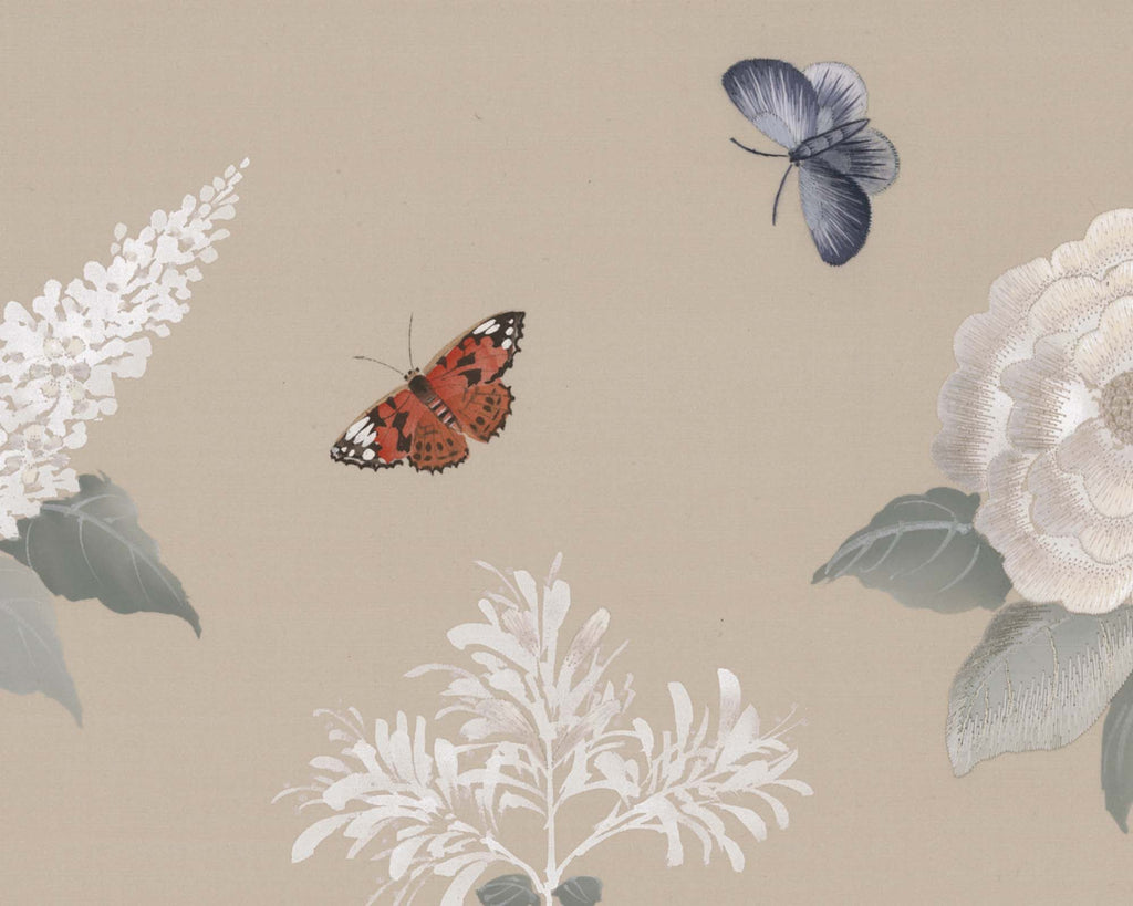 Hand-painted in an unconscious chinoiserie style and embroidered by our artists on a silk ground, the design features many of Katharine’s favourite flora and fauna, including honeysuckle, camellias, duchess peonies, jasmine and forget me nots. A nibbling dormouse peeks through the leafy grove and a kaleidoscope of butterflies flutter above.
