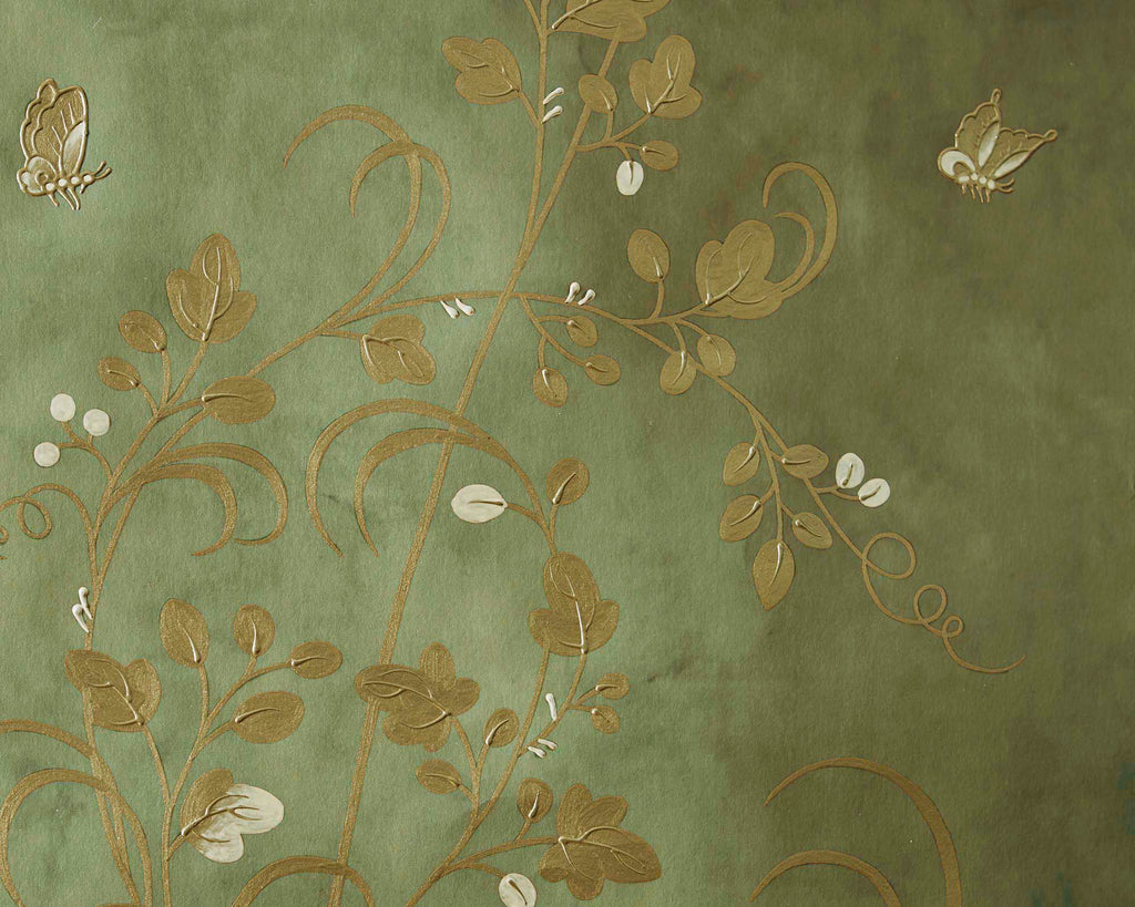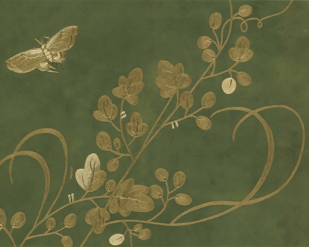 Inspired by 18th-century French lacquer work, Foliage depicts delicate curved branches and leaves surrounded by birds and butterflies.