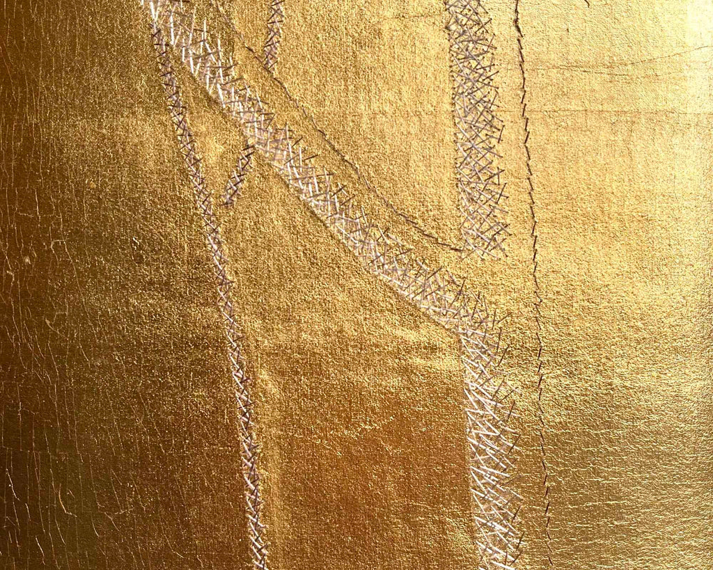 Gilded silk lends the refined composition of this design an opulent edge. Its golden surface catches and releases the light throughout the day, casting a warm, ever-shifting glow.