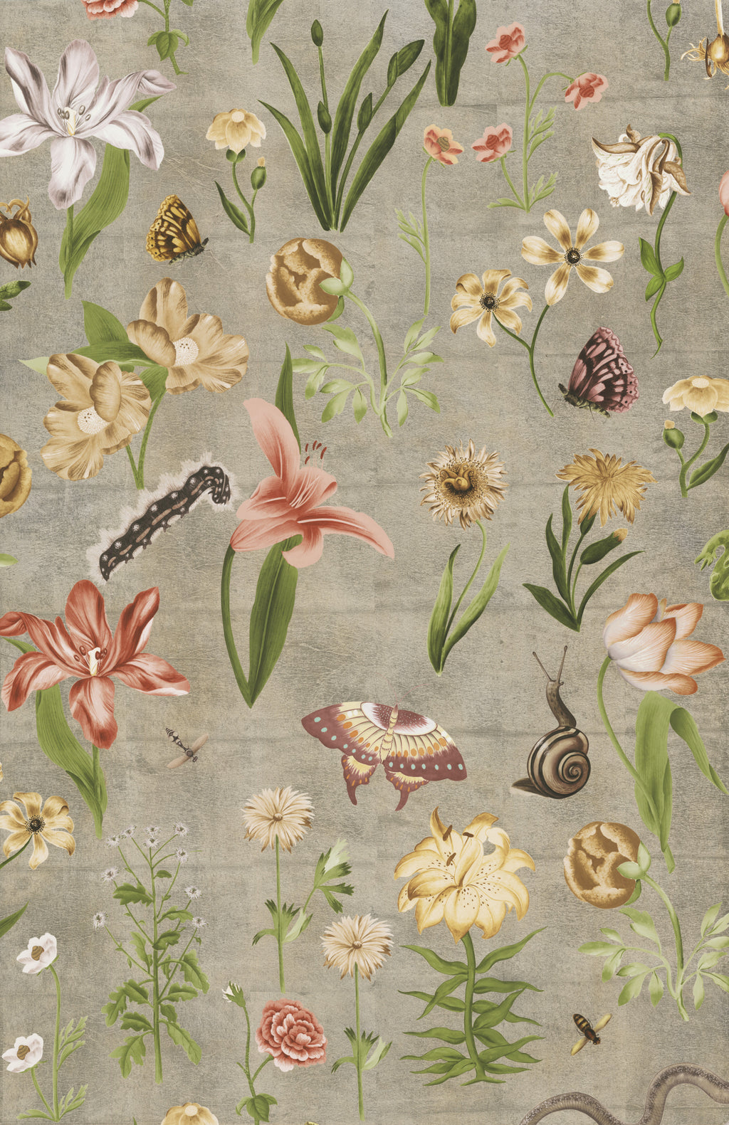 A whimsical composition where an array of delicate wildflowers and creatures dance across an iridescent champagne backdrop. Inspired by vintage botanical illustrations, this piece captures the charm of spring’s awakening within an ethereal secret garden.