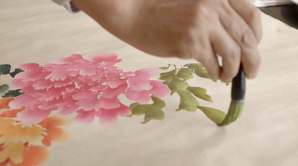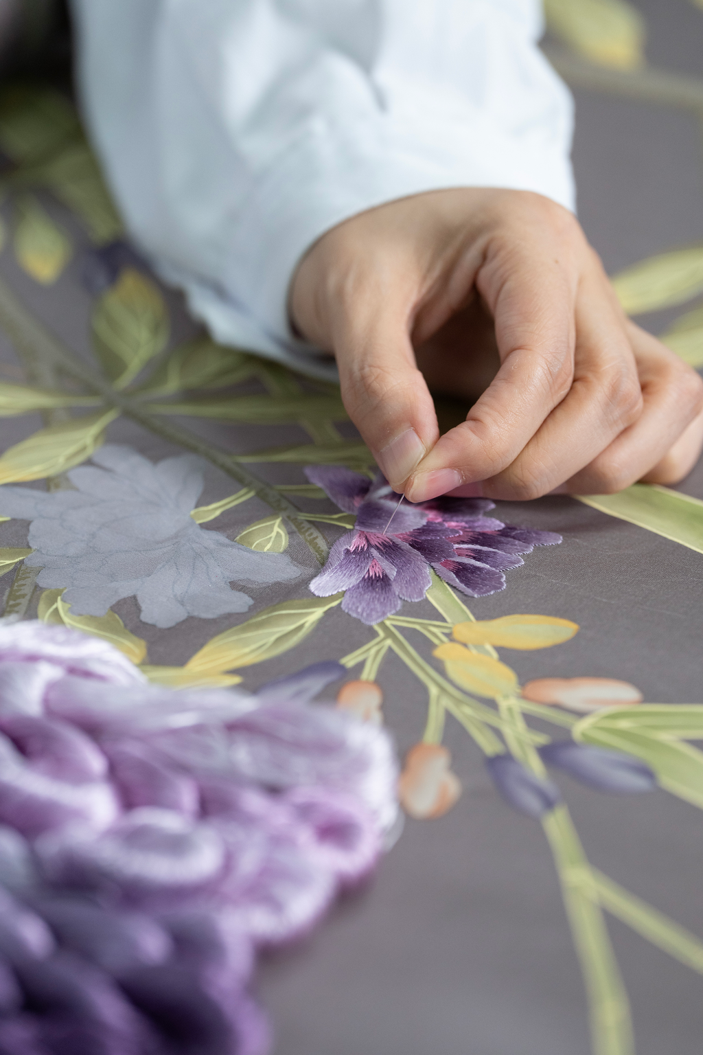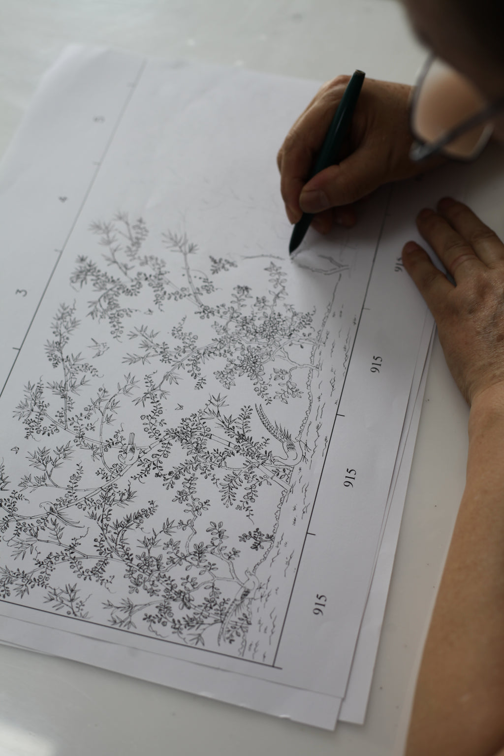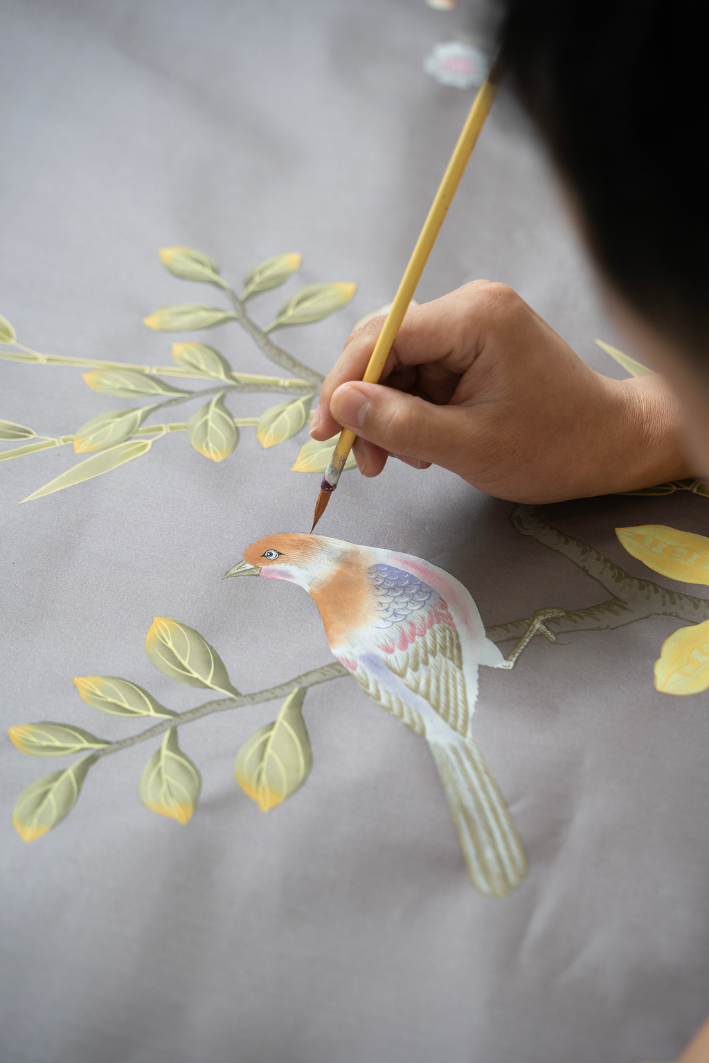 Meanwhile, every design in our printed wallpaper collection begins as a hand-painted silk panel — several skilled artists can collaborate over 50 hours to hand-finish a single piece. These panels are then scanned at ultra-high resolution and digitised.