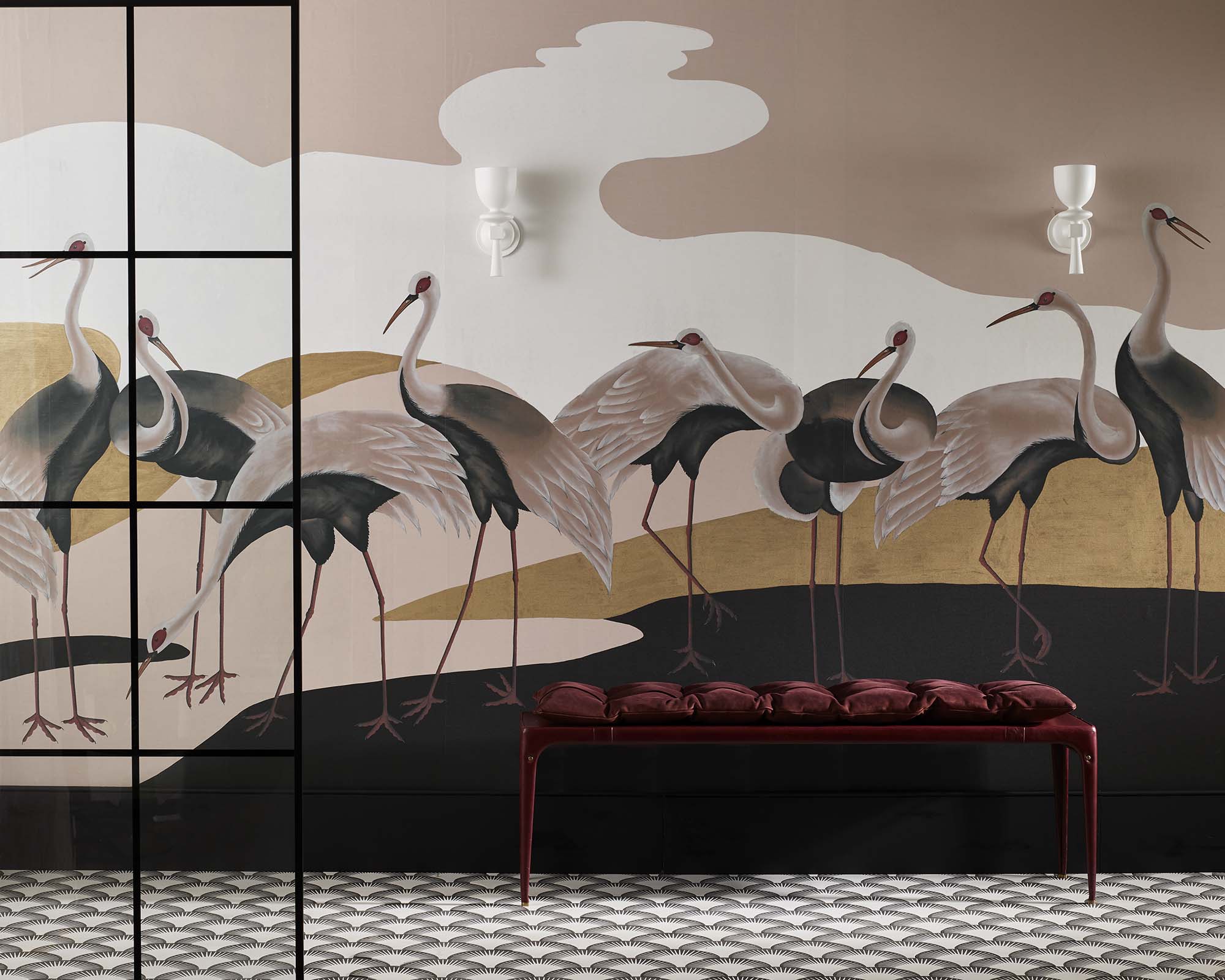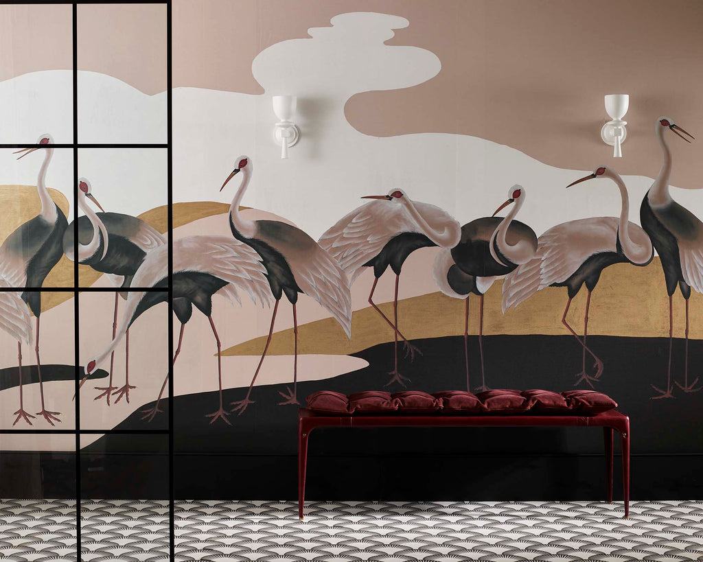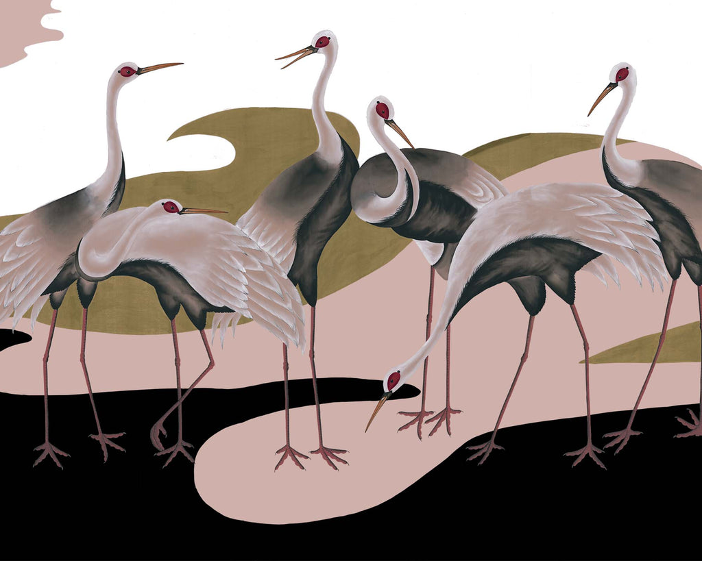A modern take on the Rinpa School style, Flock is a majestic scene of cranes-symbolising good fortune and eternal youth.
