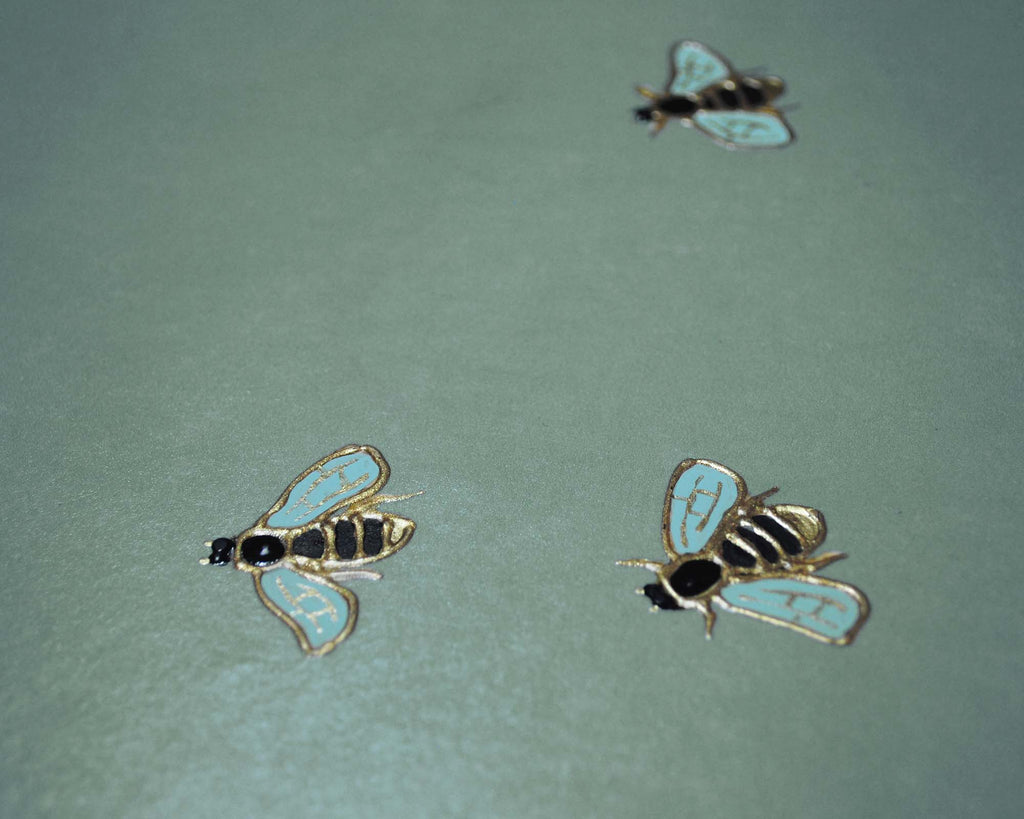Metallic bees shimmer on waxed buckskin, their lacquered forms catching the light with effortless elegance.