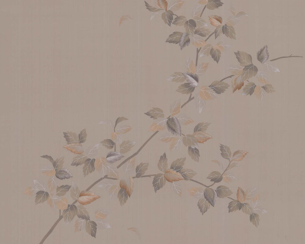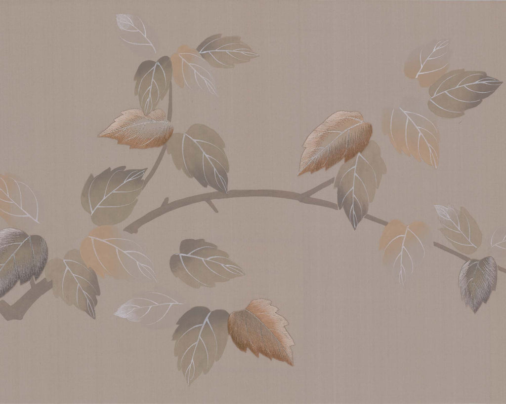 Delicately executed leaves dance across the wall, brushed with metallic touches and embroidery.