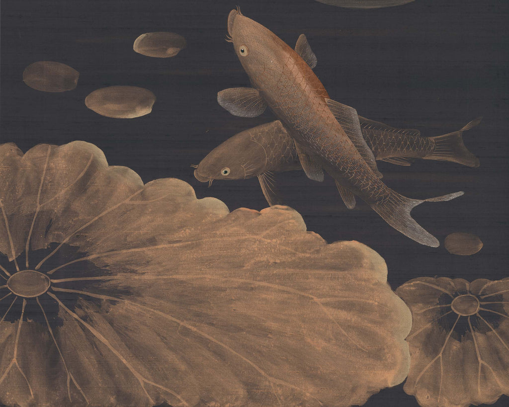 A serene composition where koi drift among floating lotus leaves, their movement mirrored in the silk’s lustrous, rippling surface.