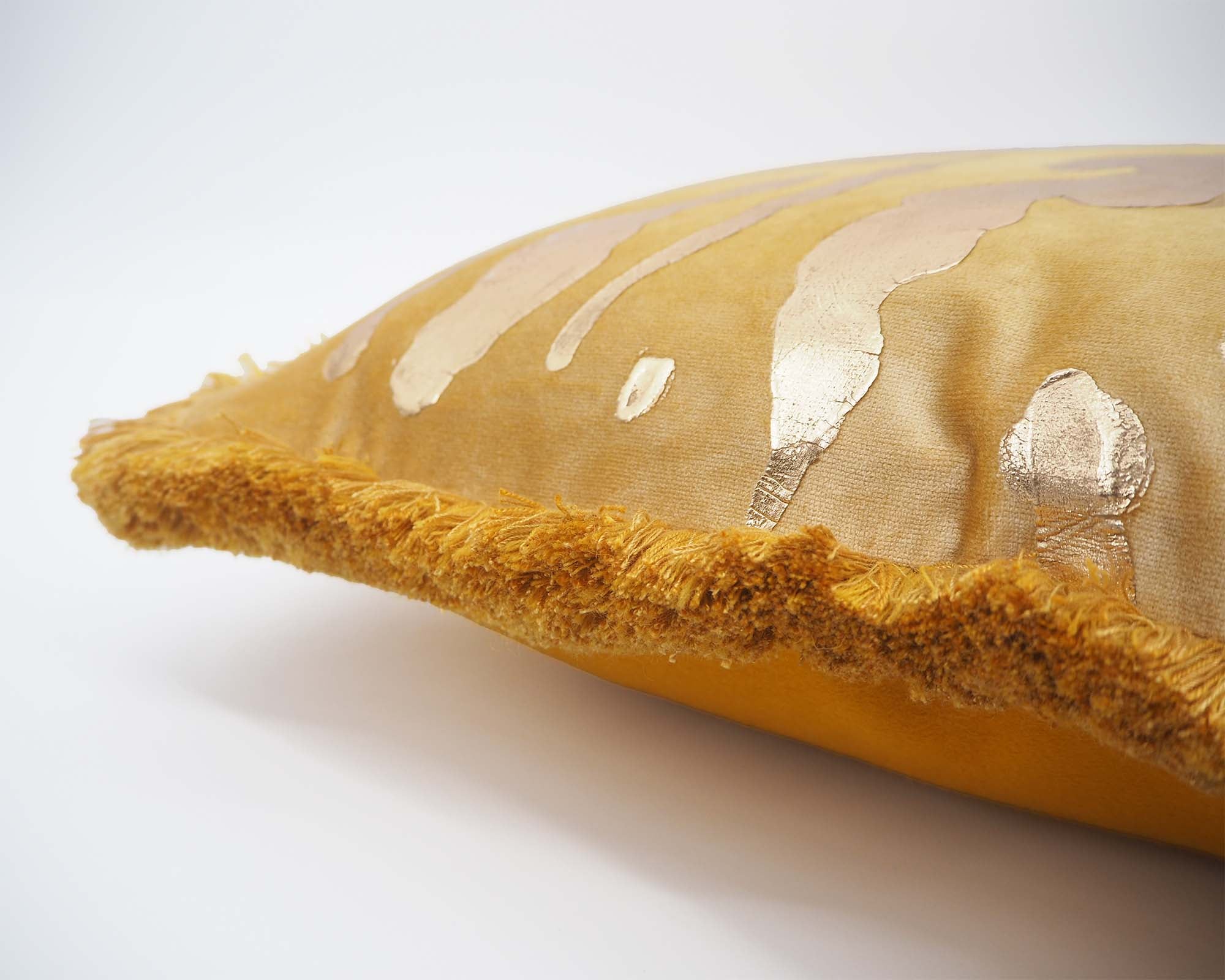 Hand-gilded on a rich velvet pile, tiger stripes stretch across three bold, expressive colourways, finished with a fringed trim.