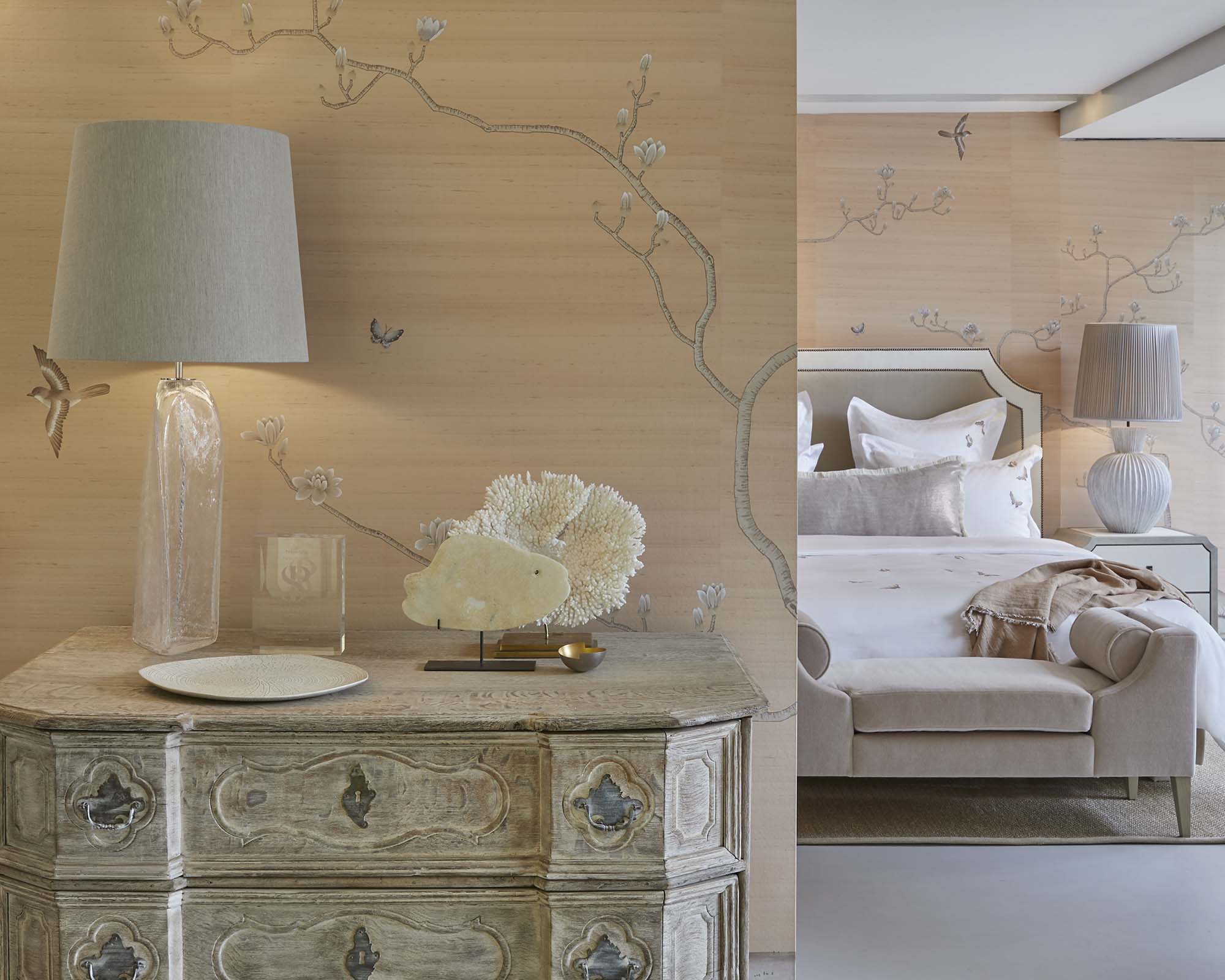 Ava was our first collaboration with the brilliant Sophie Paterson; a beautifully reserved Chinoiserie design, hand-painted, delicate butterflies and birds flutter effortlessly among the minimalist trees.
