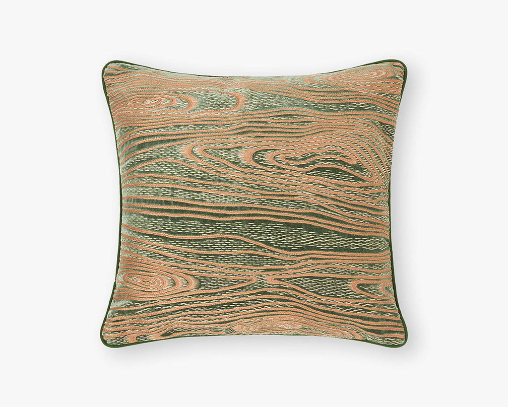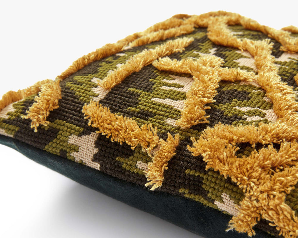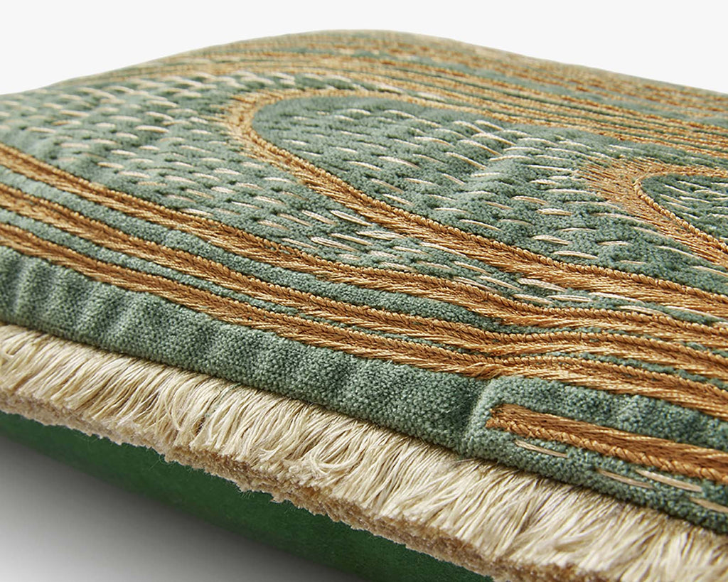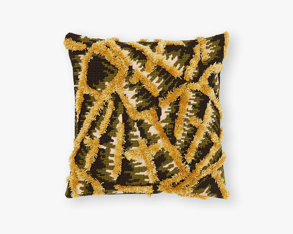 Our Construct cushion is inspired by their screw mobile structures, which featured long metal rods that created sweeping fans of light. With our cushion, these geometric forms are hand-rendered using a mixture of metallic embroidery threads on a velvet background.