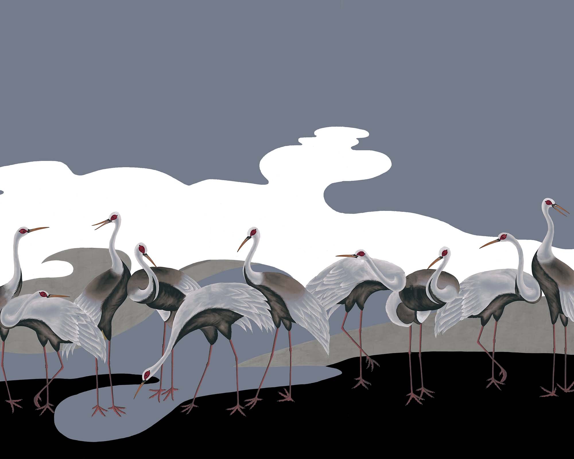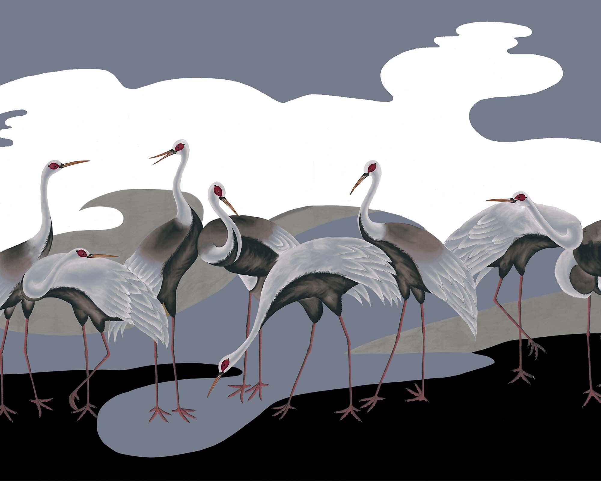 • Fabled to live for thousands of years, cranes are a symbol of good fortune and eternal youth. A modern take on the Rinpa School style, Flock is a captivating scene of majestic cranes elegantly dancing across the room. The dramatic landscape is created with contrasting pigment and metallic ink, allowing for a bold backdrop to a wonderfully charismatic design. The majority of our Flock colourways are back-printed onto Rayonne and hand-finished in our studios. The exception is Luna, which is fully hand-painted onto gilded paper. Panels can be purchased as a straight run or tailored to fit your space.
