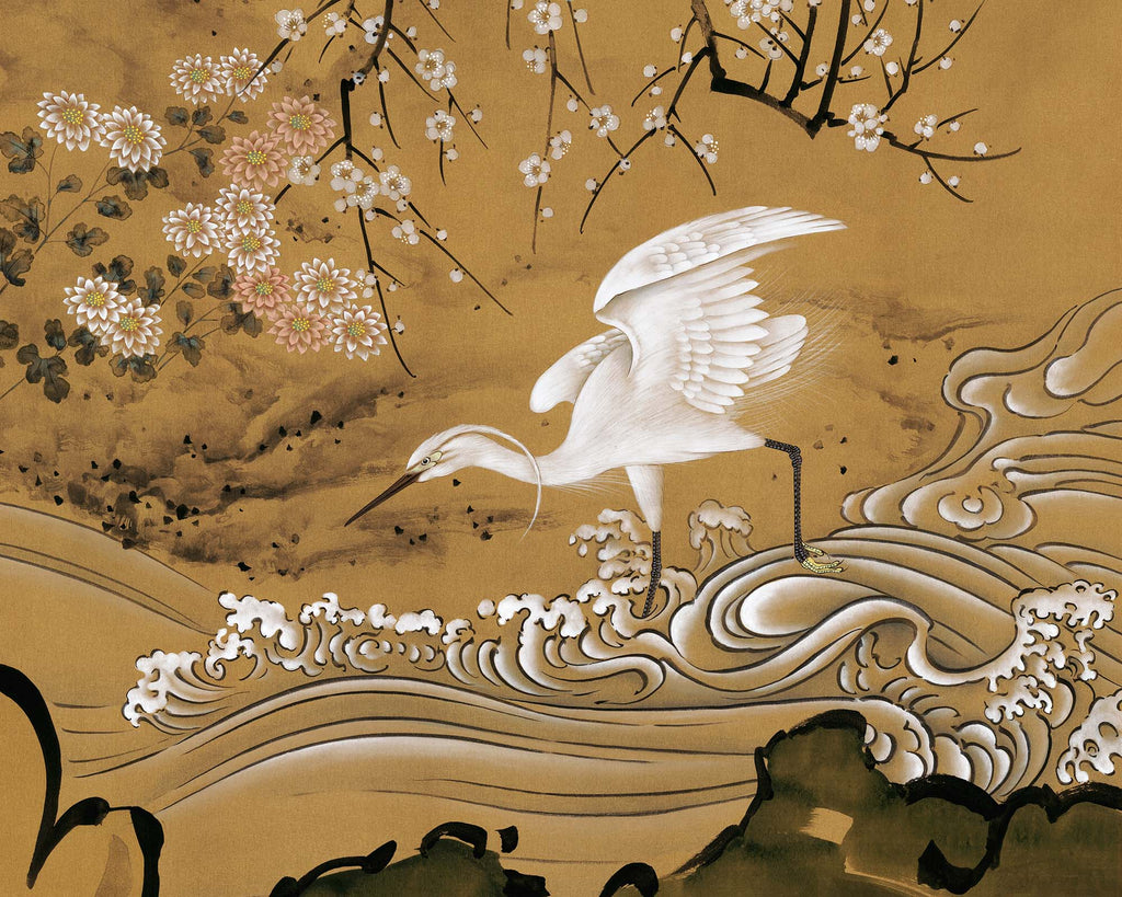 Our Folly design layout is at once bold, classical and whimsical. The scene moves between rocks, water and lush foliage, with beautiful birds throughout. With quite a dense layout and a deep, heavy ground comprising both land and water, the feeling is that of being immersed in a botanical paradise.