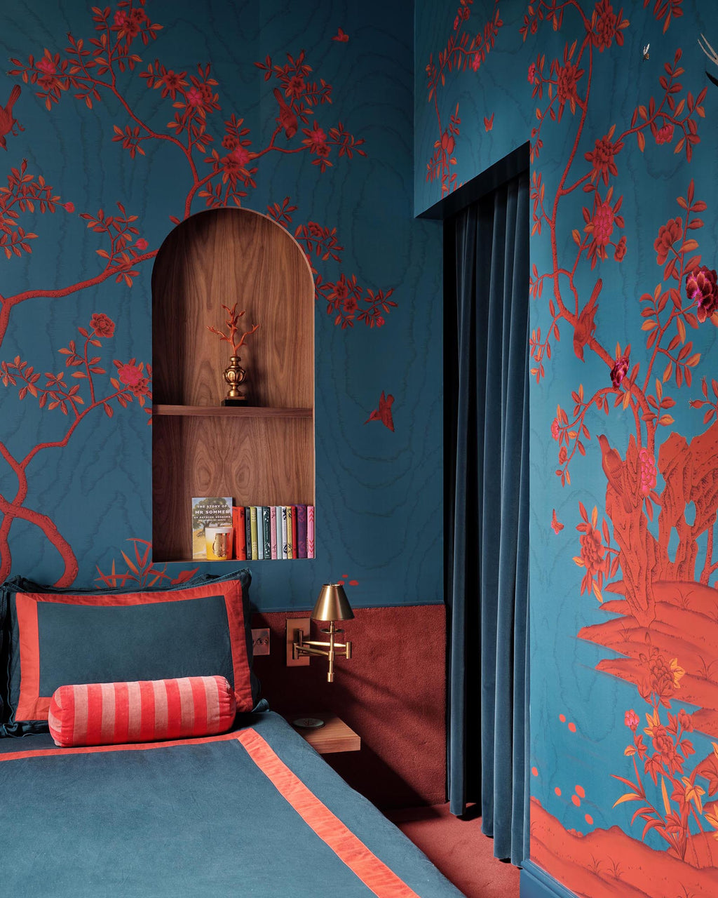 Wilde Dreams was developed in collaboration with eminent fashion designer Harris Reed, affectionately named for evoking a certain Oscar Wilde-ness. Crimson flowers and meandering branches, with pops of pink, sing out against a backdrop of kingfisher blue moiré silk.
