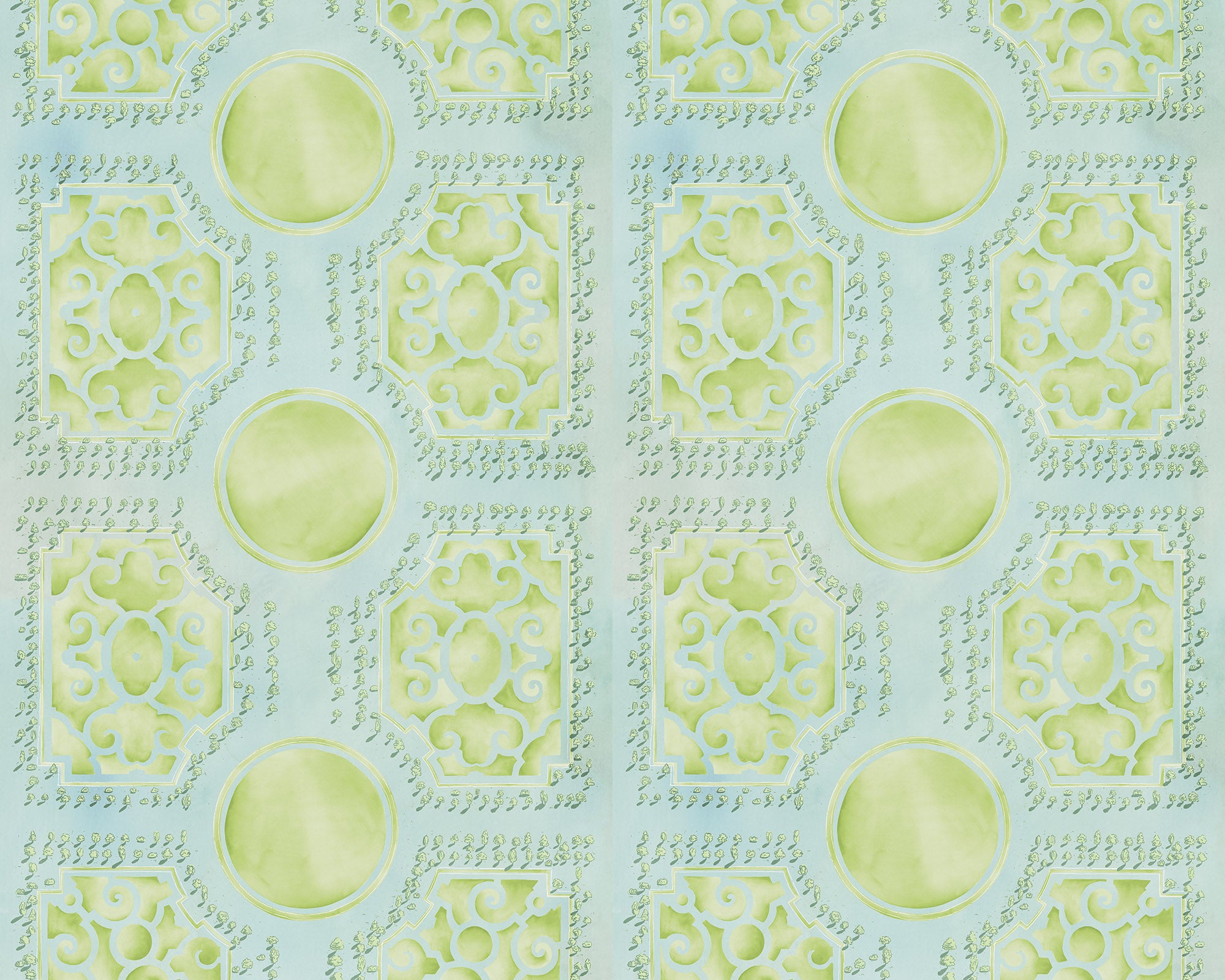 André Le Nôtre’s famous orangery parterre gardens in Versailles have been reinterpreted for current times. Jardin Français offers a modern take on the symmetrical garden patterns of old, with a subtle colour palette and a wide panel repeat.