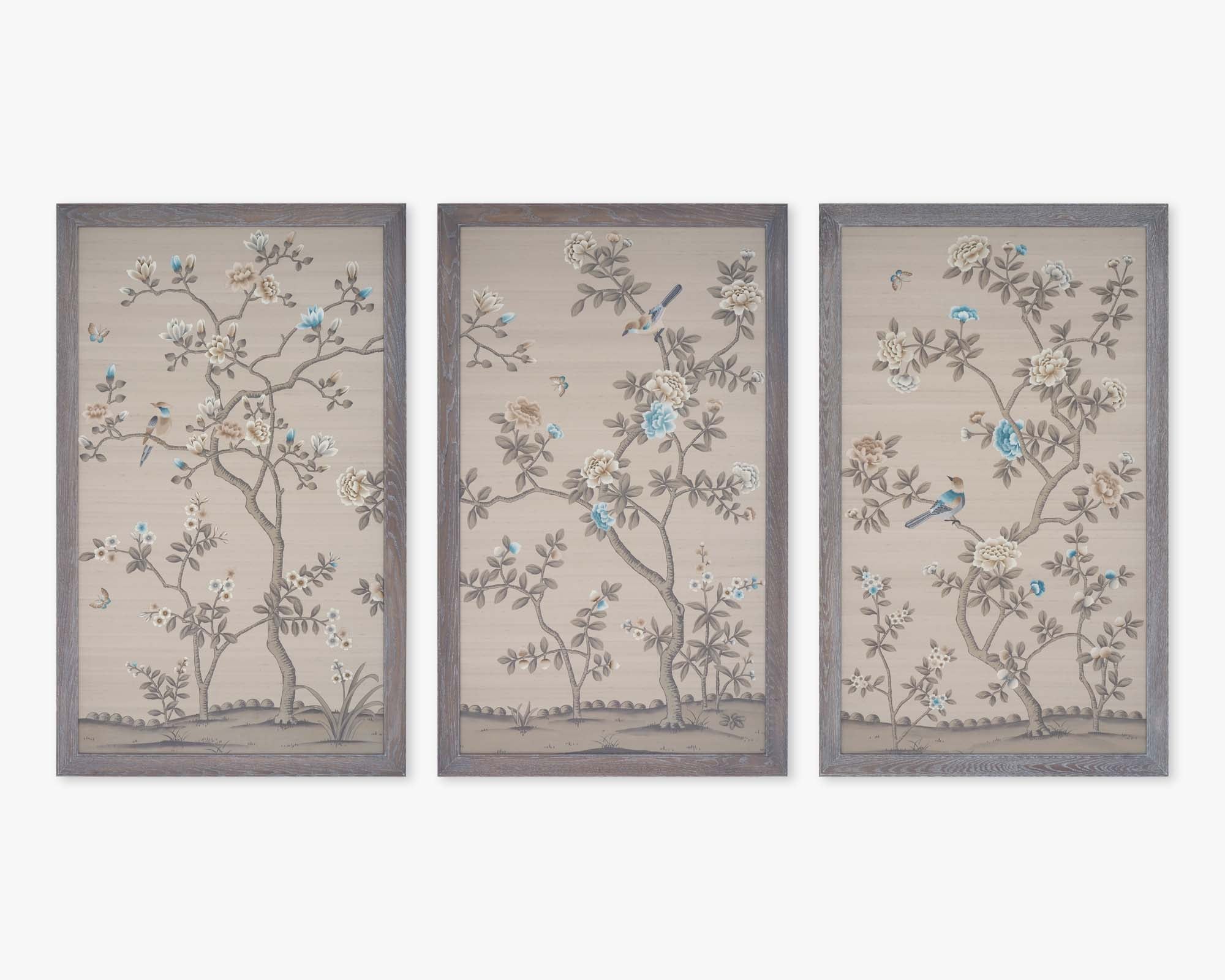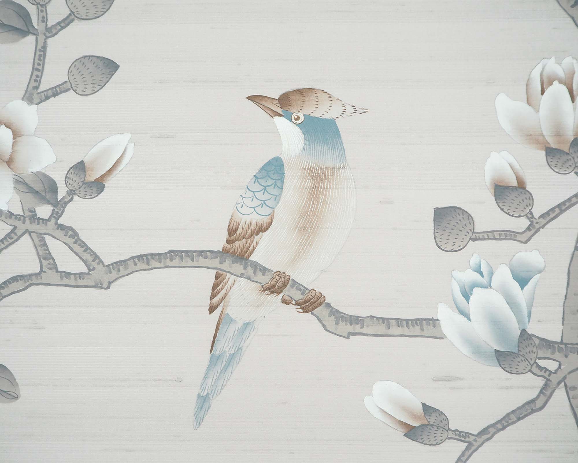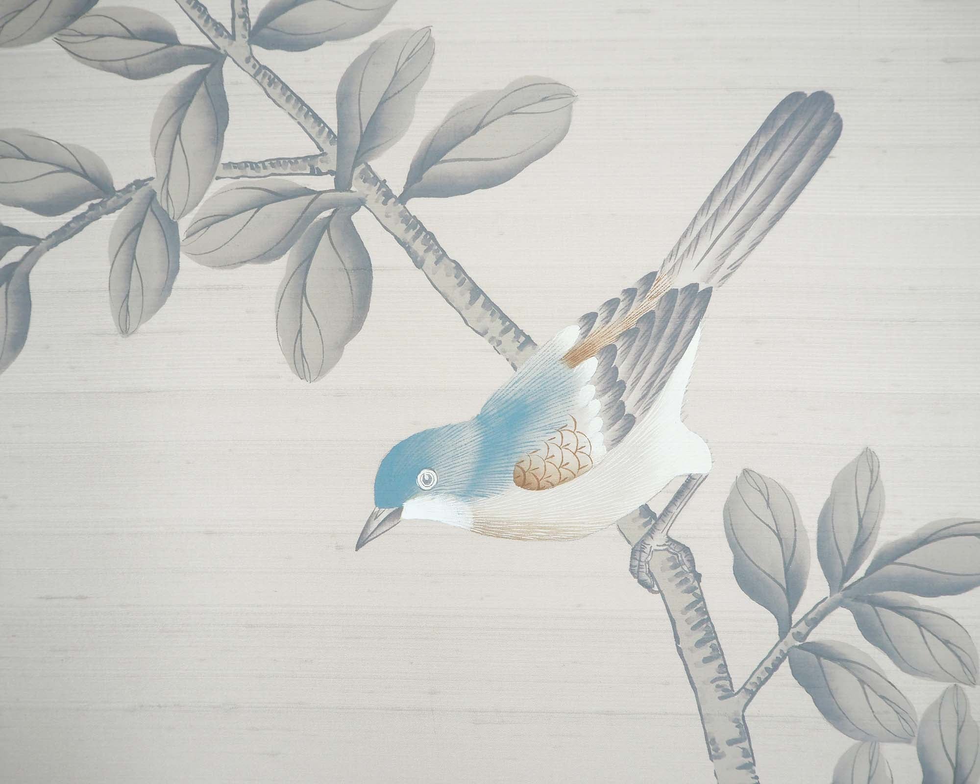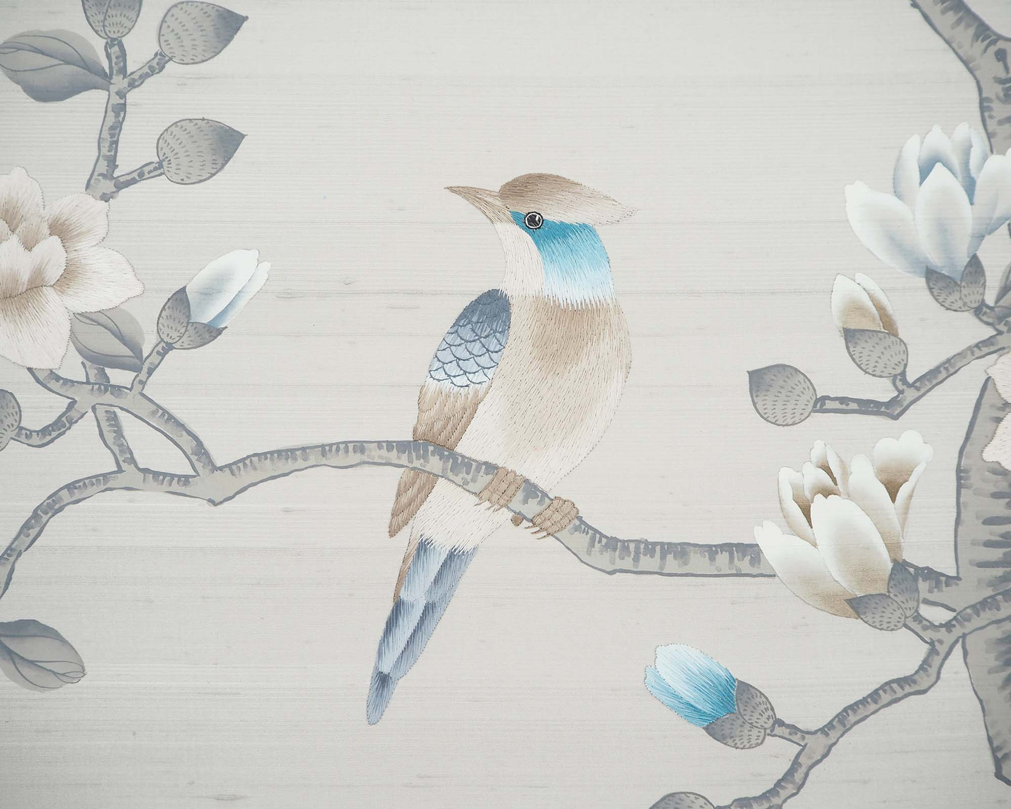 In Blue Haze, a warm taupe Dupion silk ground provides the perfect canvas for a balanced palette of warm neutrals and greys, accented with soft touches of blue.