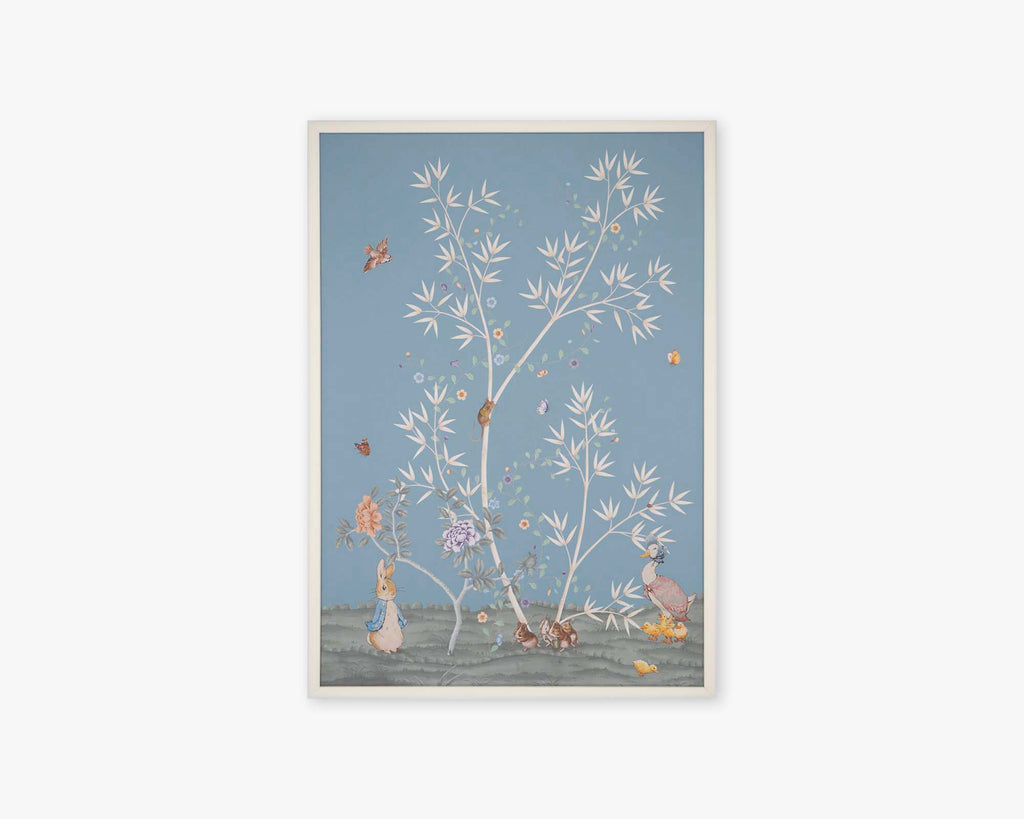 Framed in oak with a pickled finish, soft tones are enriched with dark oil and gold wax, subtly catching the light and accentuating the chinoiserie composition.