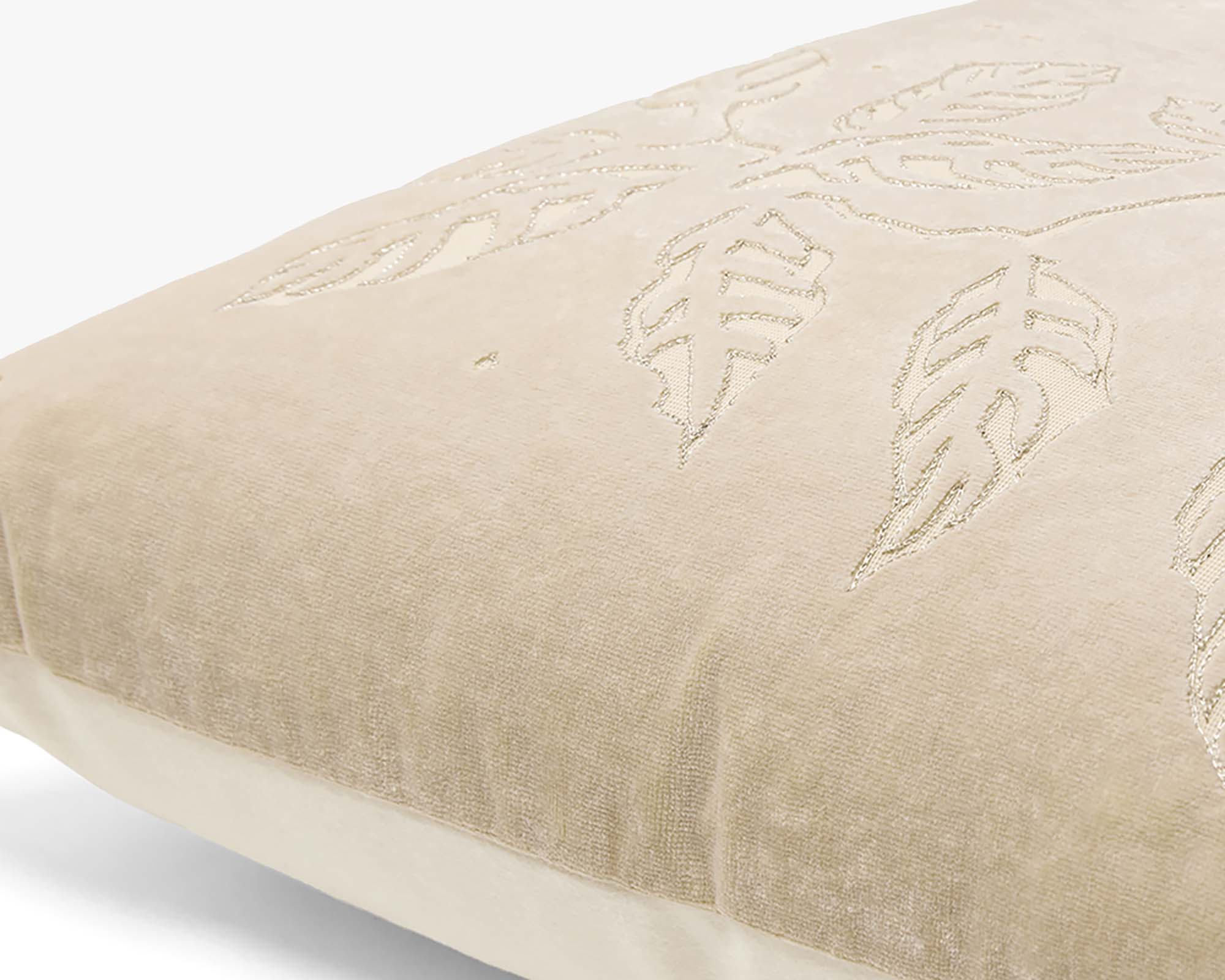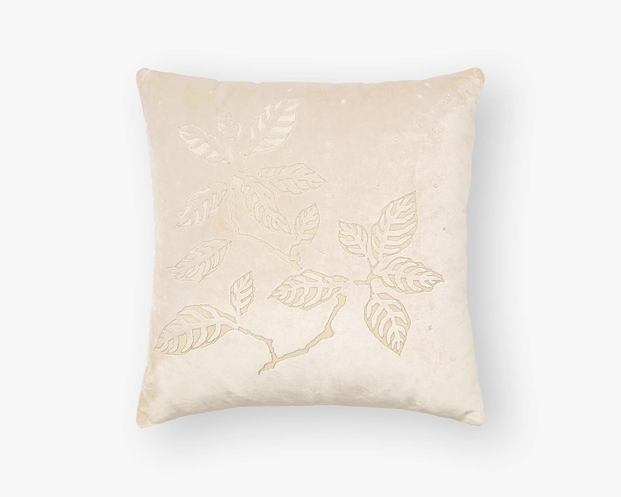 Plucked Leaf features a botanical motif where the velvet nap is meticulously hand- plucked to reveal contrasting textures that catch and reflect light beautifully. The delicate leaf pattern is then over- embroidered with silver thread, creating a sophisticated interplay of tone and texture.