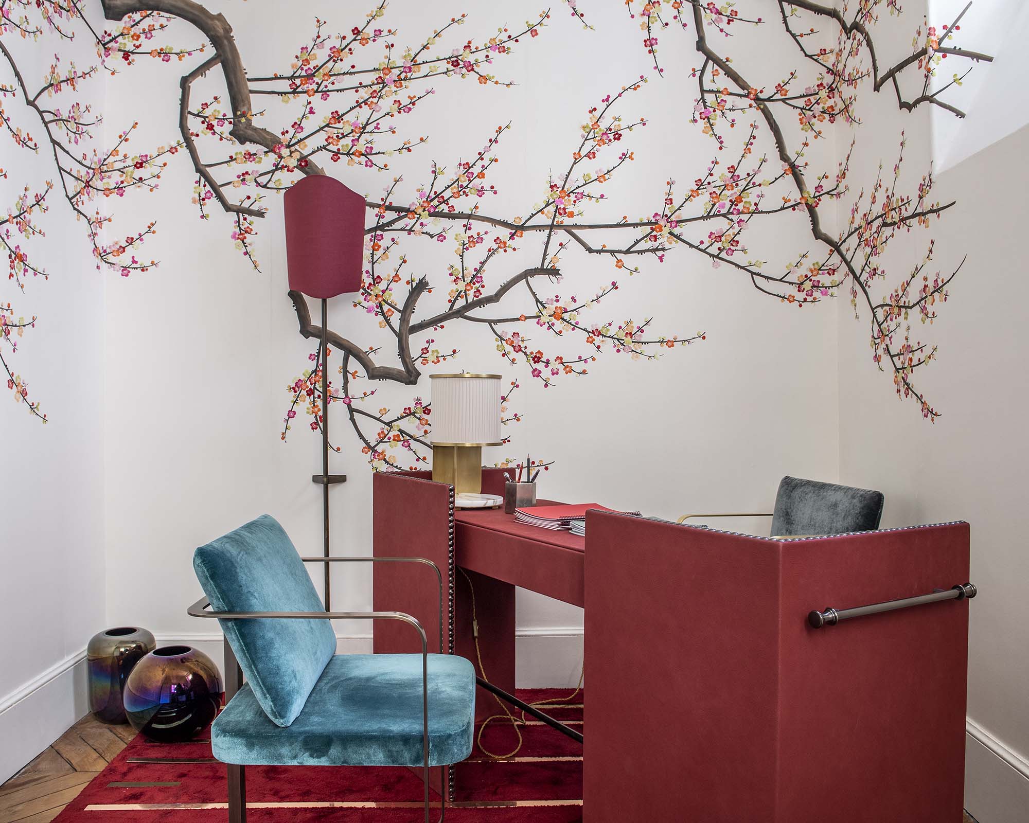 Prunus draws on the rich history of traditional plum blossom painting. A combination of our ‘unconscious’ painting style – which uses graceful, gestural brushstrokes – and the dazzling lustre of the hand-embroidered silk thread gives it an otherworldly beauty. Prunus is a remarkably adaptable design as we offer it in three different layouts. This means you are free to choose the scheme that best suits your space, depending on whether there is low- or high-level furniture, bedside panelling, narrow joinery, etc.