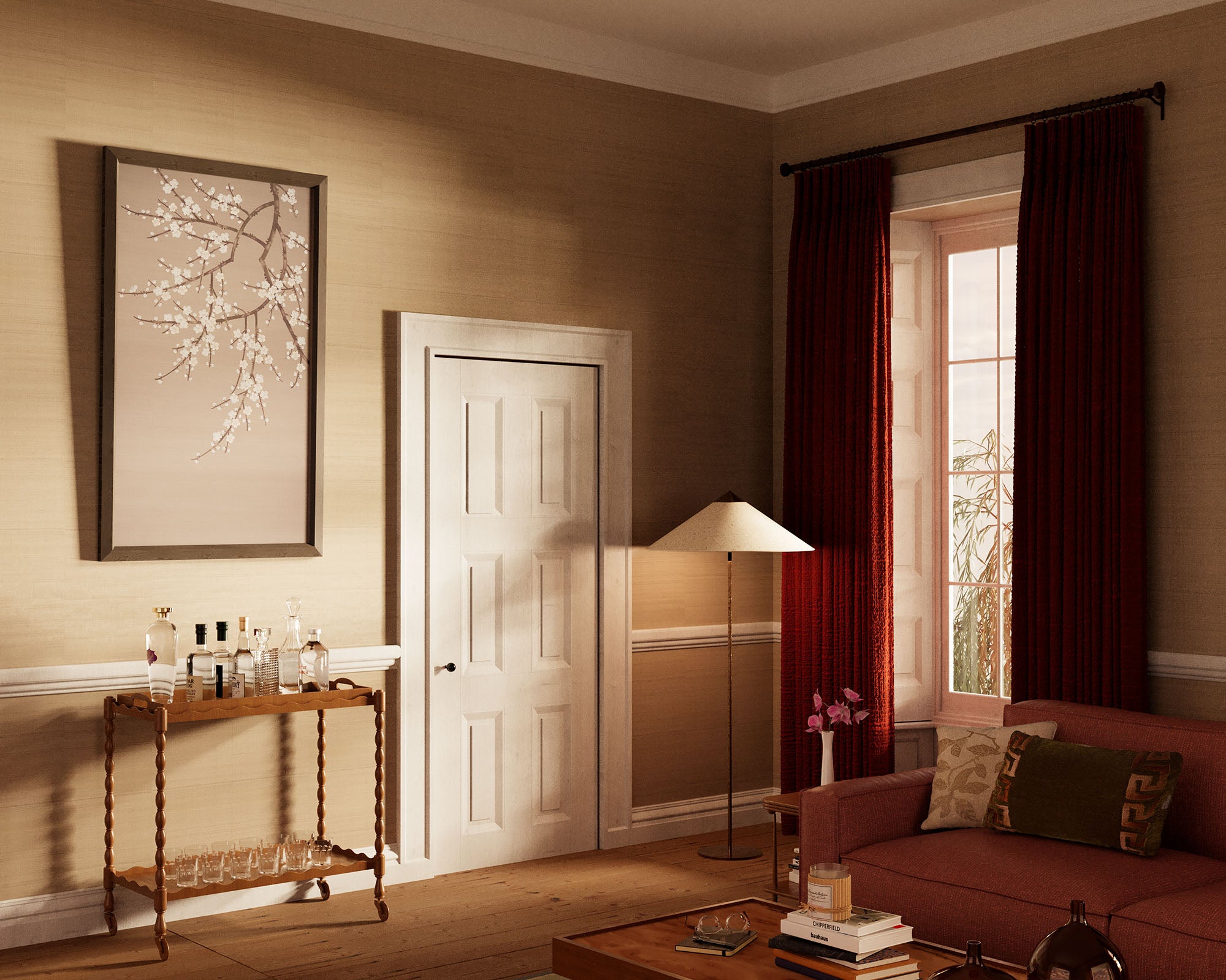 The artwork’s oak frame, with a pickled finish softened by clear oil and gold wax, tempers the vibrancy of the artwork, adding a muted, matte texture.
