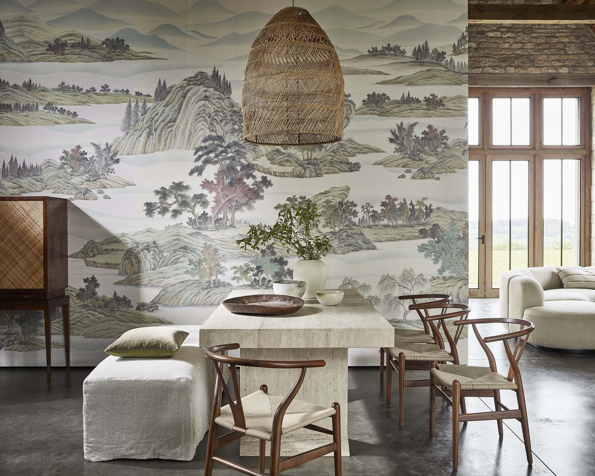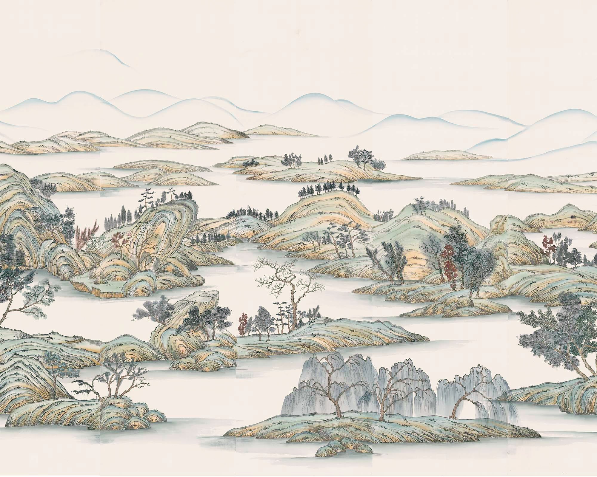 Roxy Mountains combines both the conventions of the hanging scroll and the handscroll, which can be understood in two very distinct ways: one conveys a grander vista, while the other, sequential and panoramic, invites a more intimate viewing. The lyrical subtlety of this landscape is painted with great refinement onto silk organza and rendered in delicate hues by our Master Artist. The naming of the design and colourways refers to a photograph of the singer Bryan Ferry leaning on a wall decorated in the chinoiserie style – an image we have always loved.