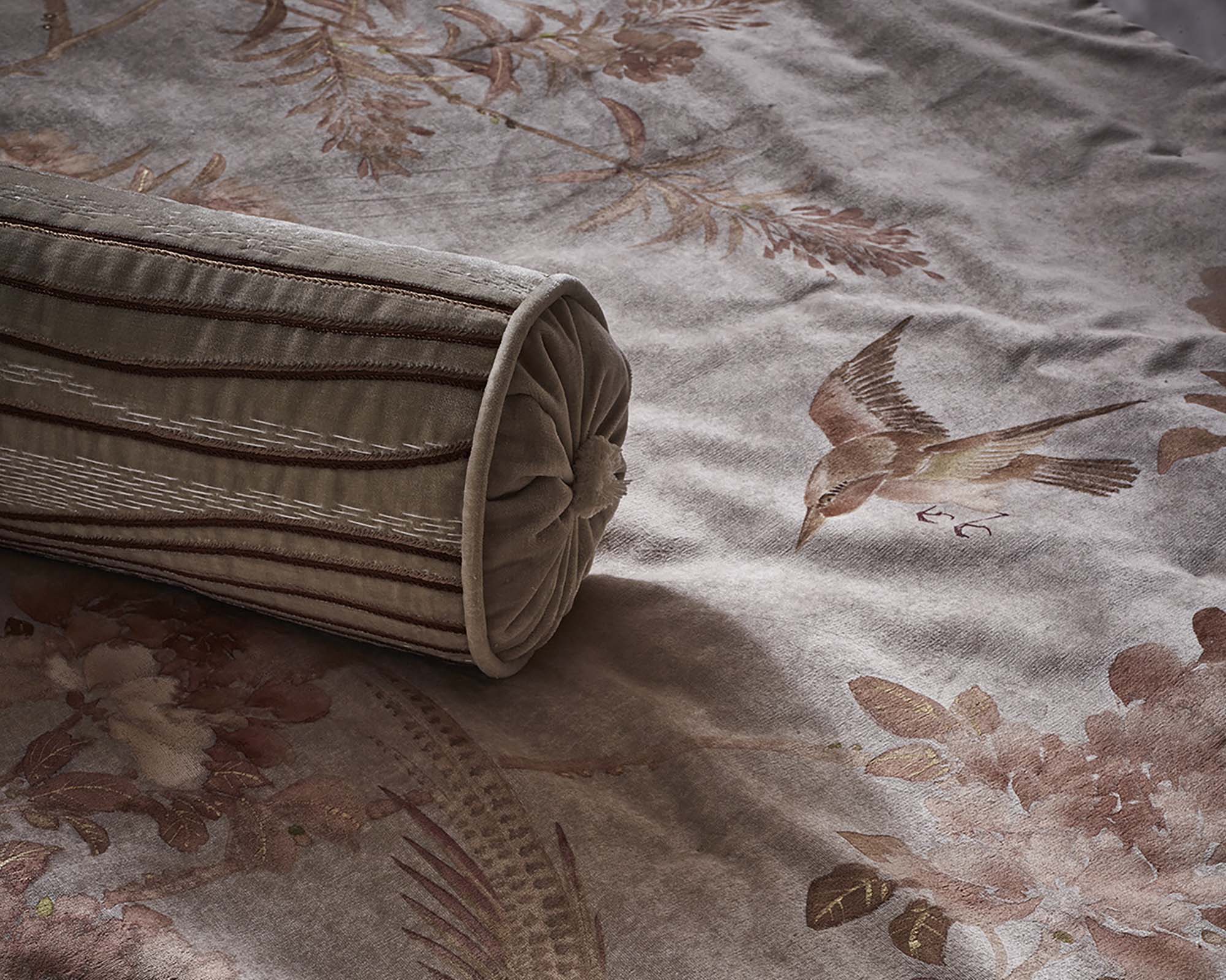 Each throw is wadded and then backed with a joyously tactile, ecologically friendly faux cashmere. Chic and monochromatic, Terra Rose celebrates rust and terracotta hues and features details exquisitely rendered in metallic bronze thread.