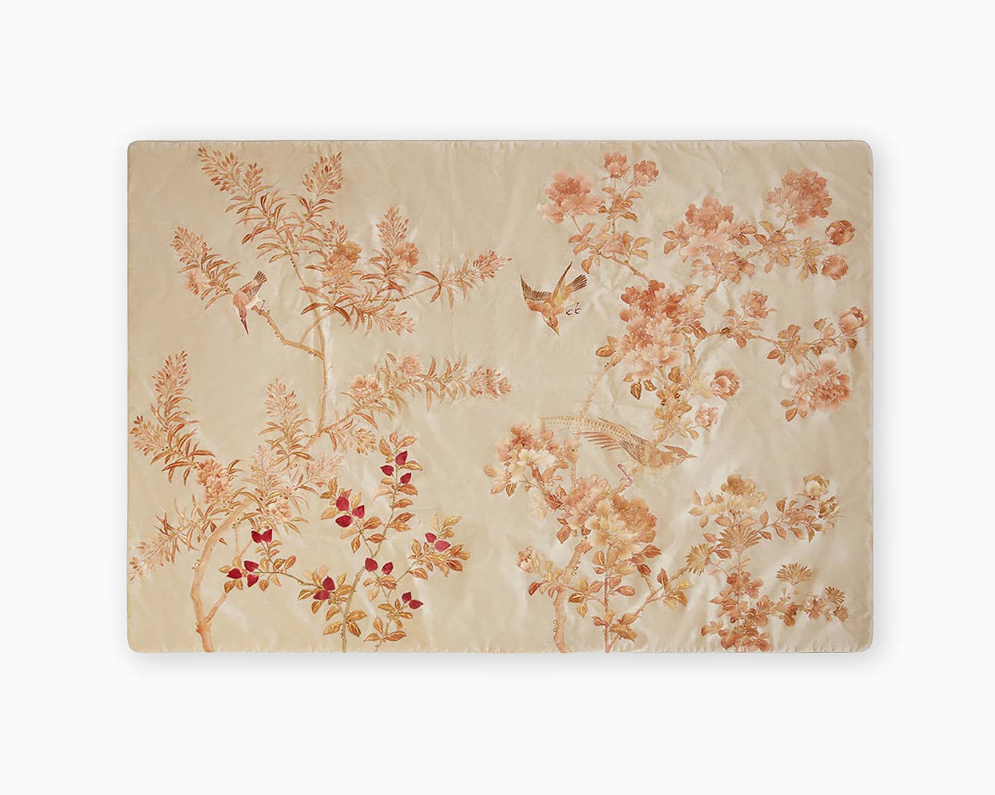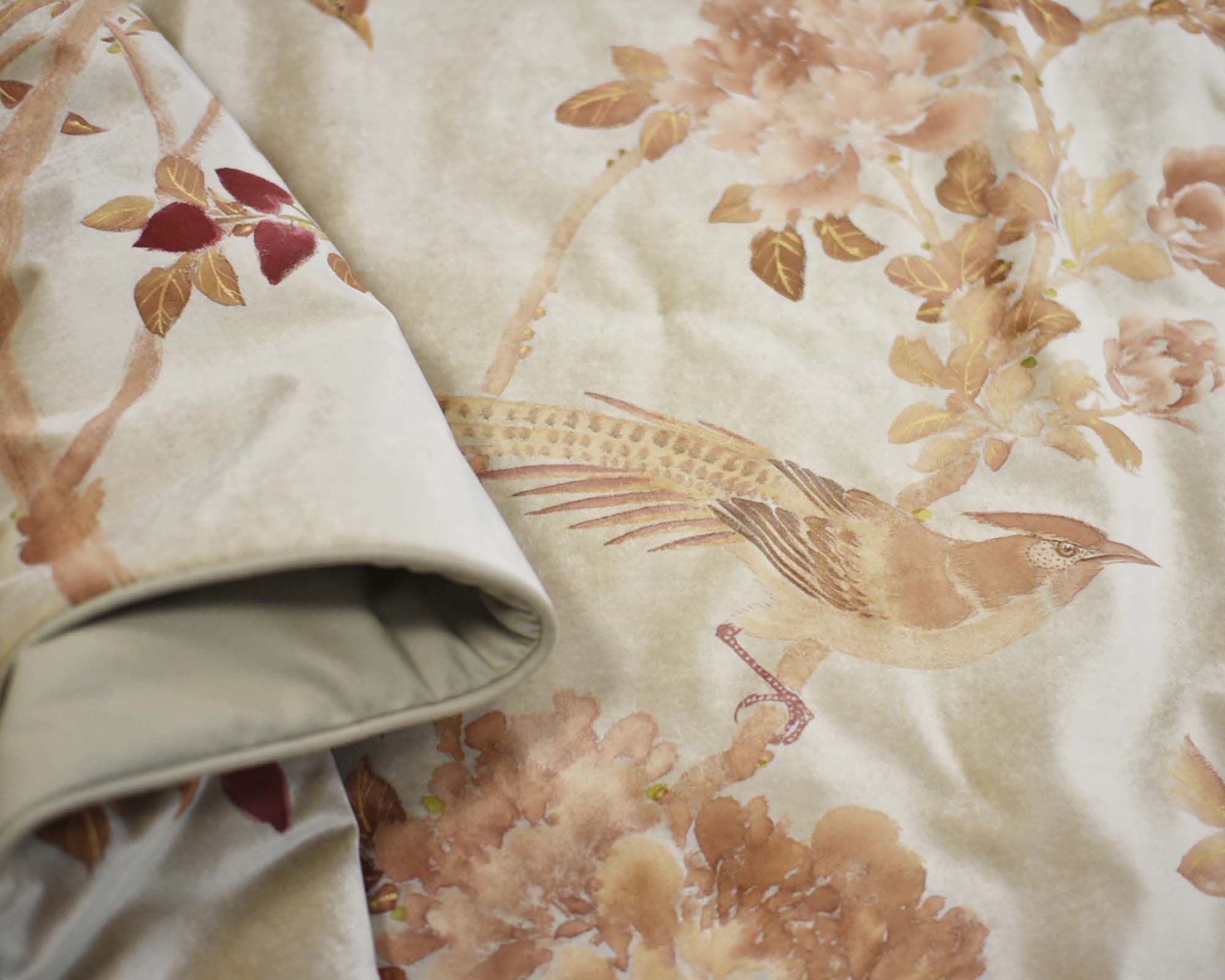 Based on a section of a traditional Chinoiserie scenic, which we have hand-painted into velvet, these one-of-a-kind pieces blur the lines between soft furnishings and fine art.