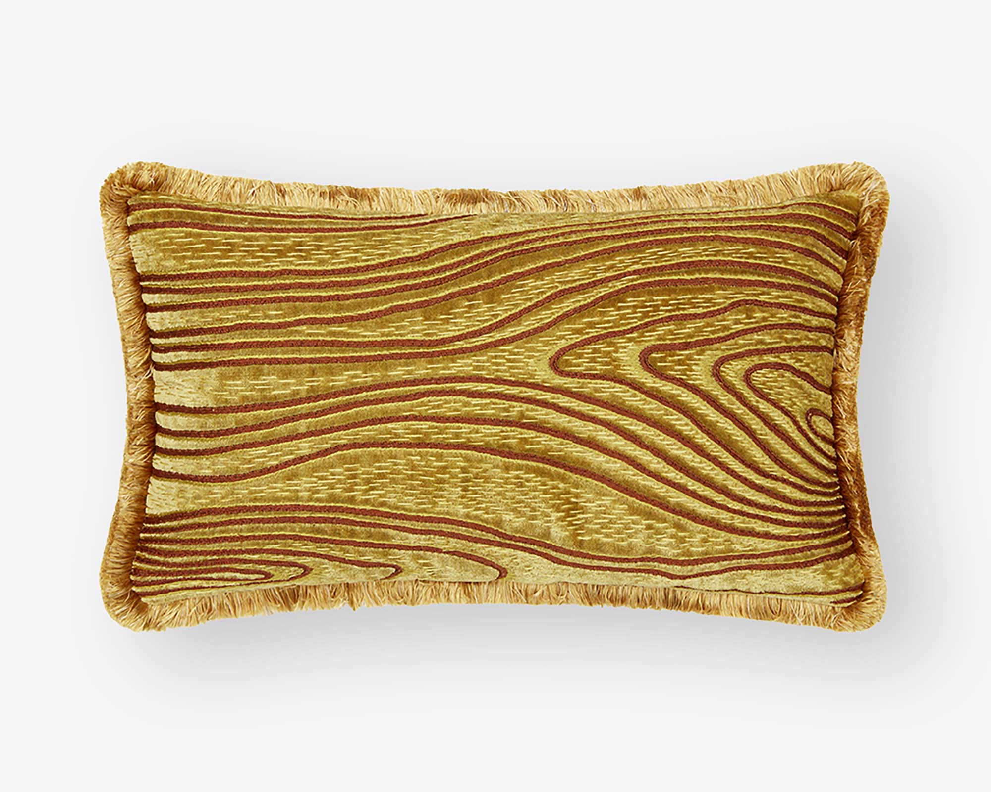 • Our Woodgrain cushion is inspired by some beautiful oak floorboards at our co-founders Tim and Lizzie’s home. These boards have had their grain blasted, then filled with gold, before being stained and varnished. Now crystalised in cushion-forn, the pattern is depicted using a silk velvet with cotton over-embroidery.
