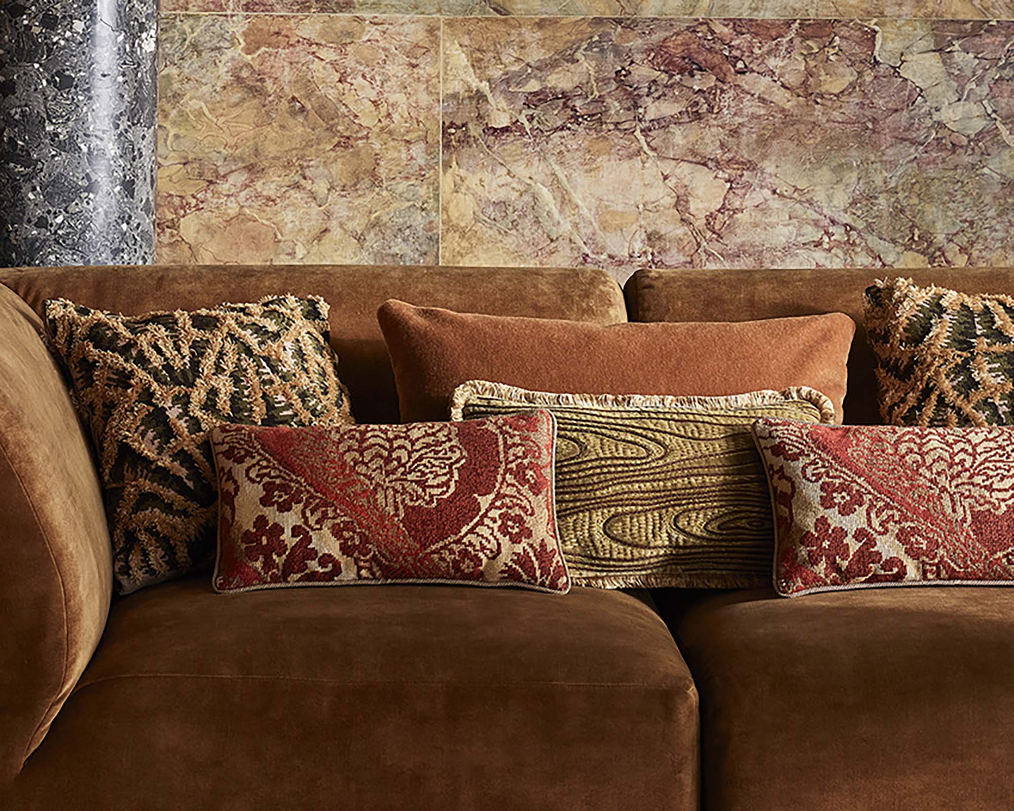 A background of cream silk velvet plays host to details in shades of chestnut, lending contrast and definition to our Woodgrain design. Bronze is a perennial favourite here at Fromental, comprised of mustard and brown. Rich, warm, tones like this are to us very earthy, very reassuring.