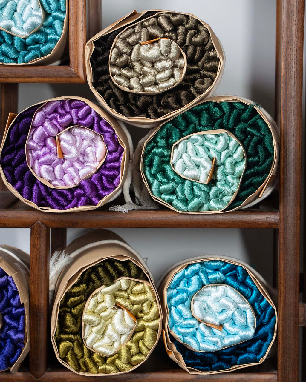 For embroidery, we use ultra-fine unspun silk floss, hand-dyed in small batches with thousands of available shades. Embroiderers skillfully blend up to six tones of the same color to achieve subtle gradations and depth.