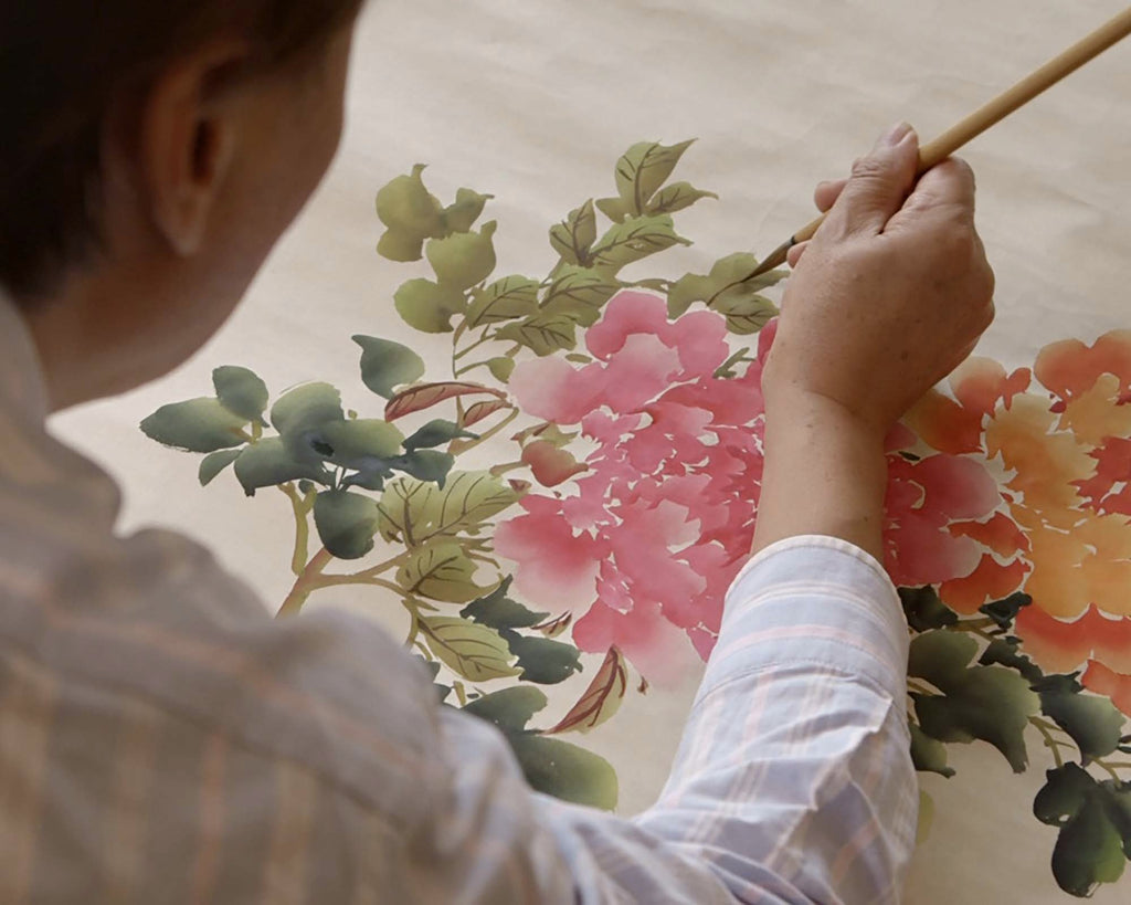 The technique uses unspun silk floss and involves incredibly fine stitching – 600 stitches for a single blossom. An individual panel can take up to 400 hours to complete. Most of our embroiderers are talented local women who work from their own homes; they collect the painted panels from our studios before taking them away to hand-embroider them. They are always very careful to coordinate with their fellow artists so that the colours and techniques flow beautifully from one panel to the next.