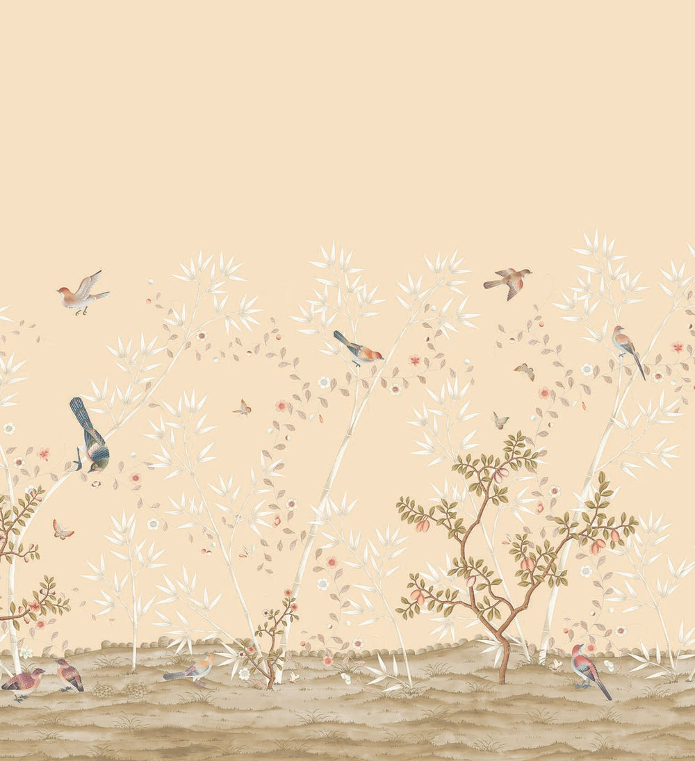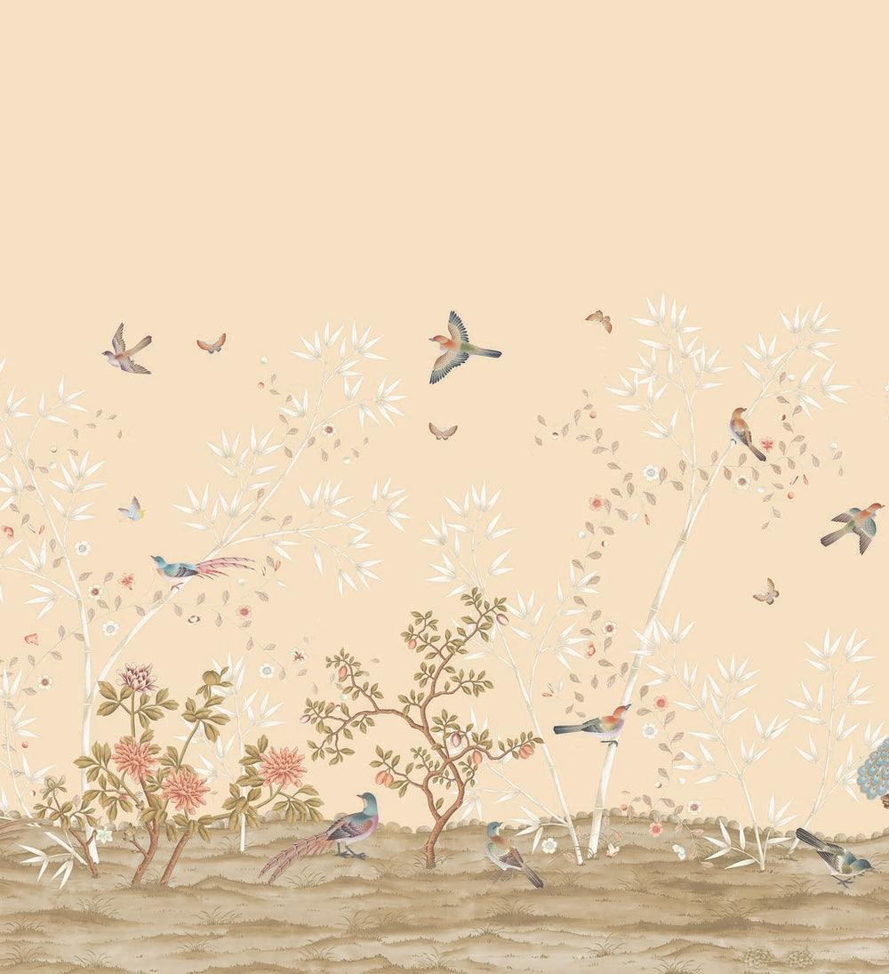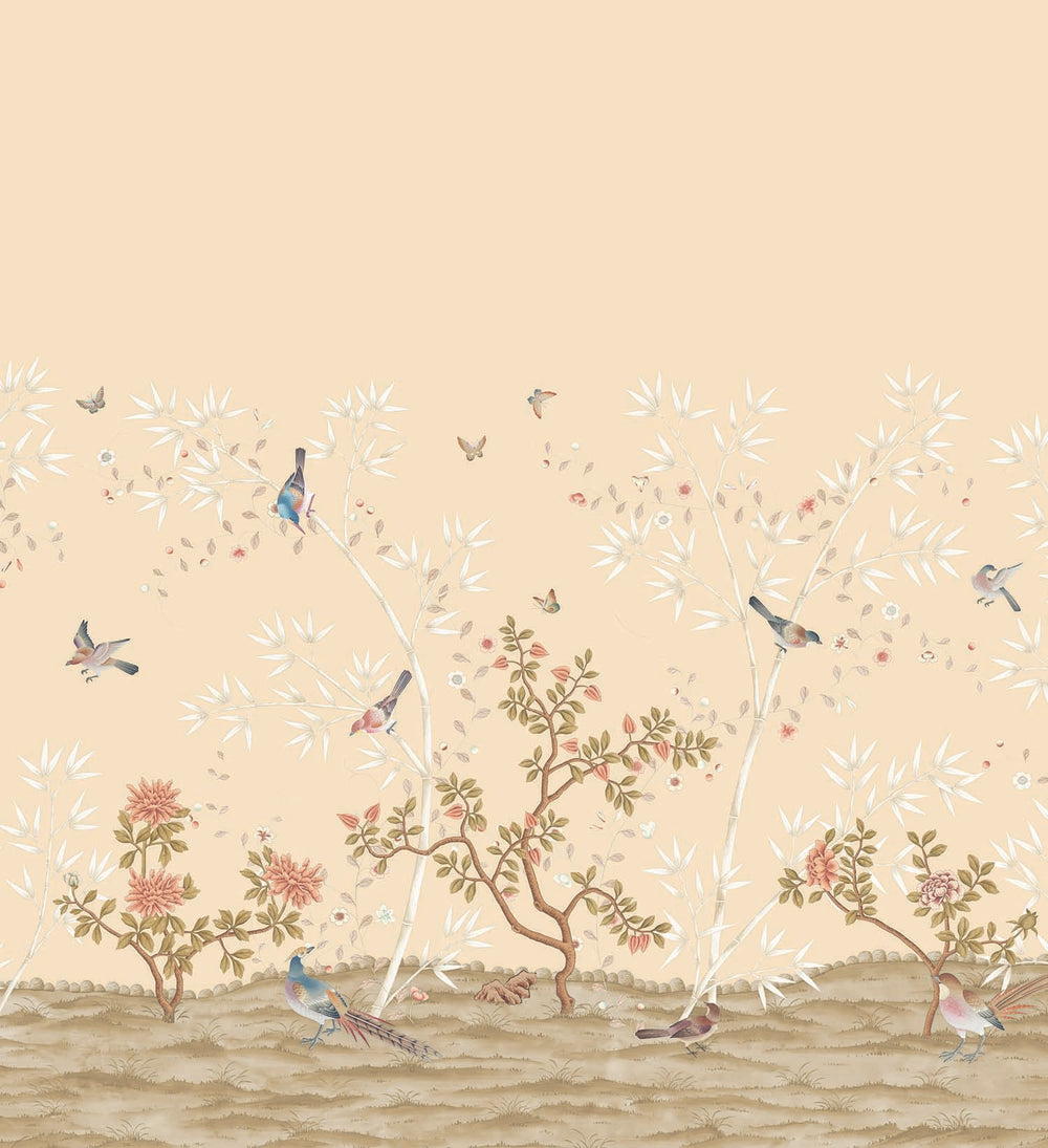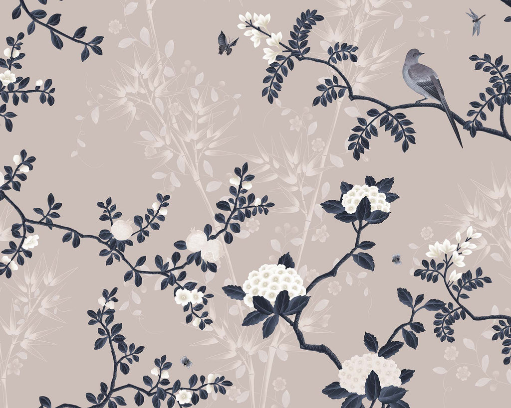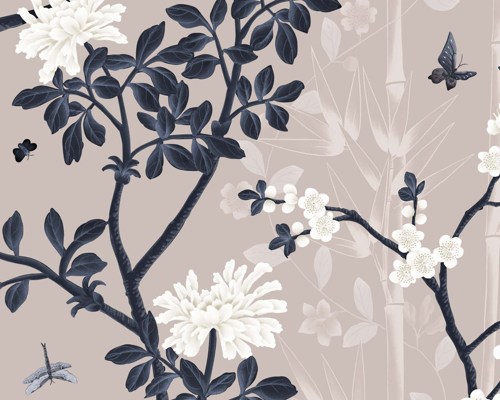 Bambois is a contemporary take on Chinoiserie, where dynamic bamboo stems form a natural framework for climbing vines, unfurling peonies, birds and butterflies. This versatile design lends itself beautifully to both bright palettes and muted monochromes