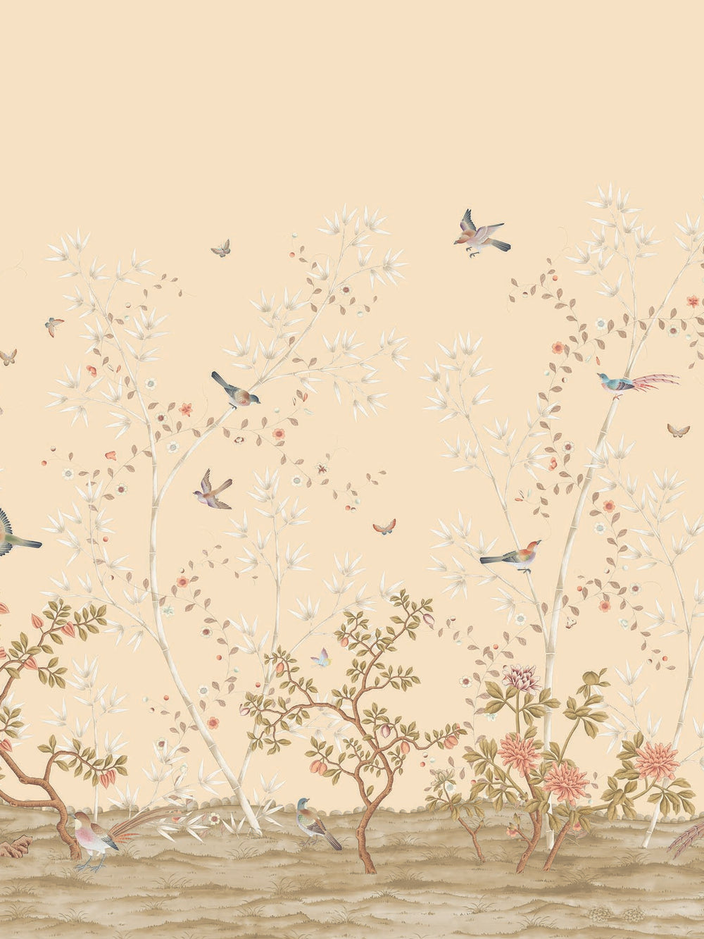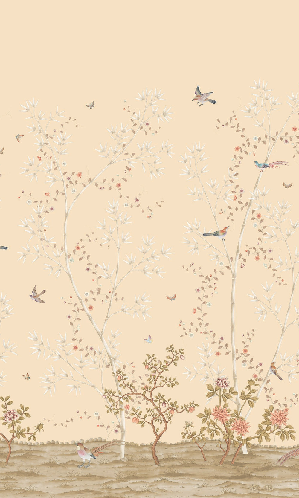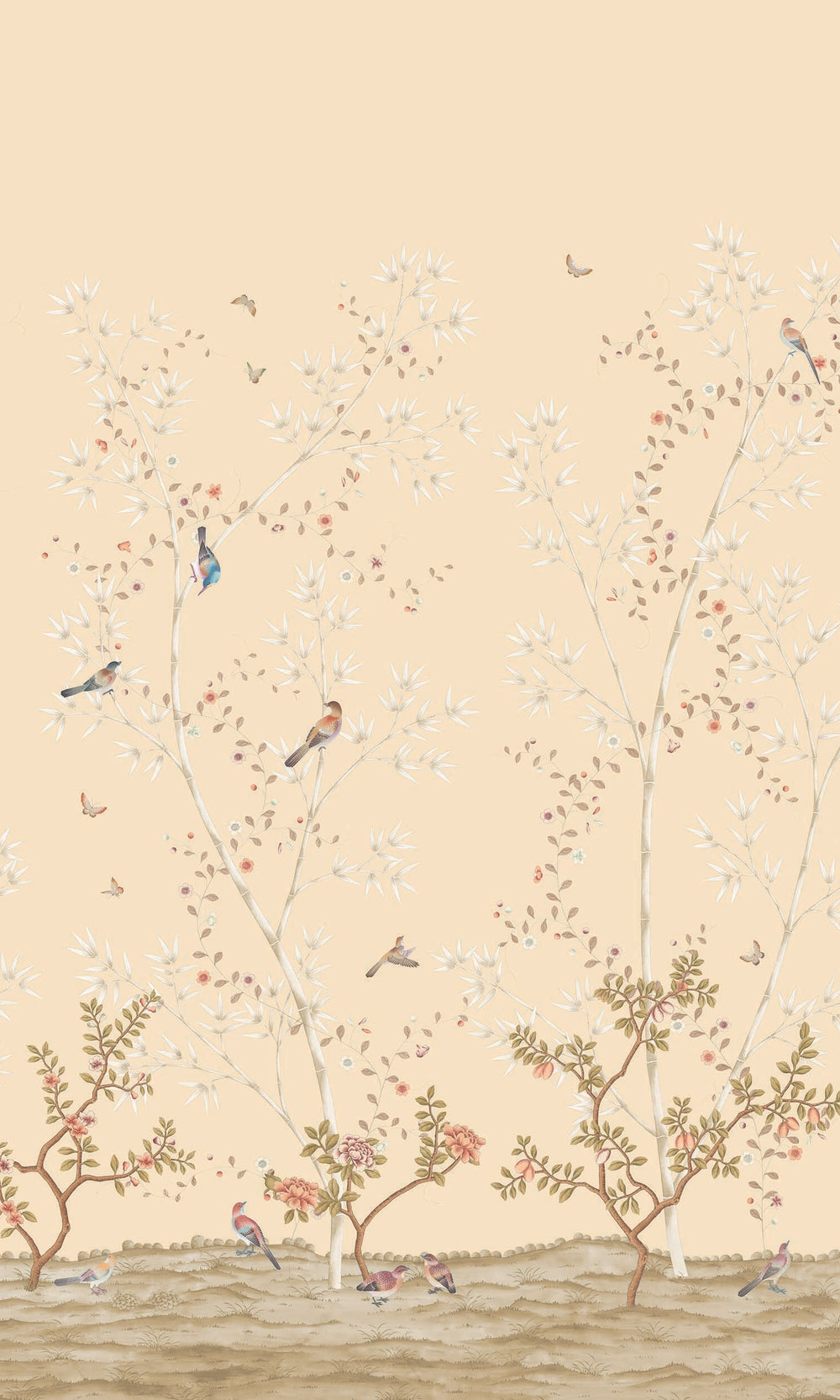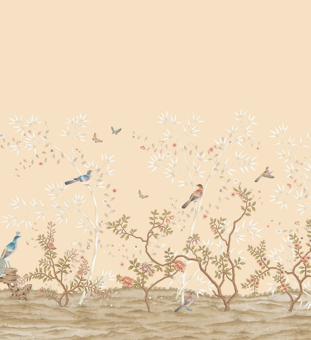Bambois is a contemporary take on Chinoiserie, where dynamic bamboo stems form a natural framework for climbing vines, unfurling peonies, birds and butterflies. This versatile design lends itself beautifully to both bright palettes and muted monochromes