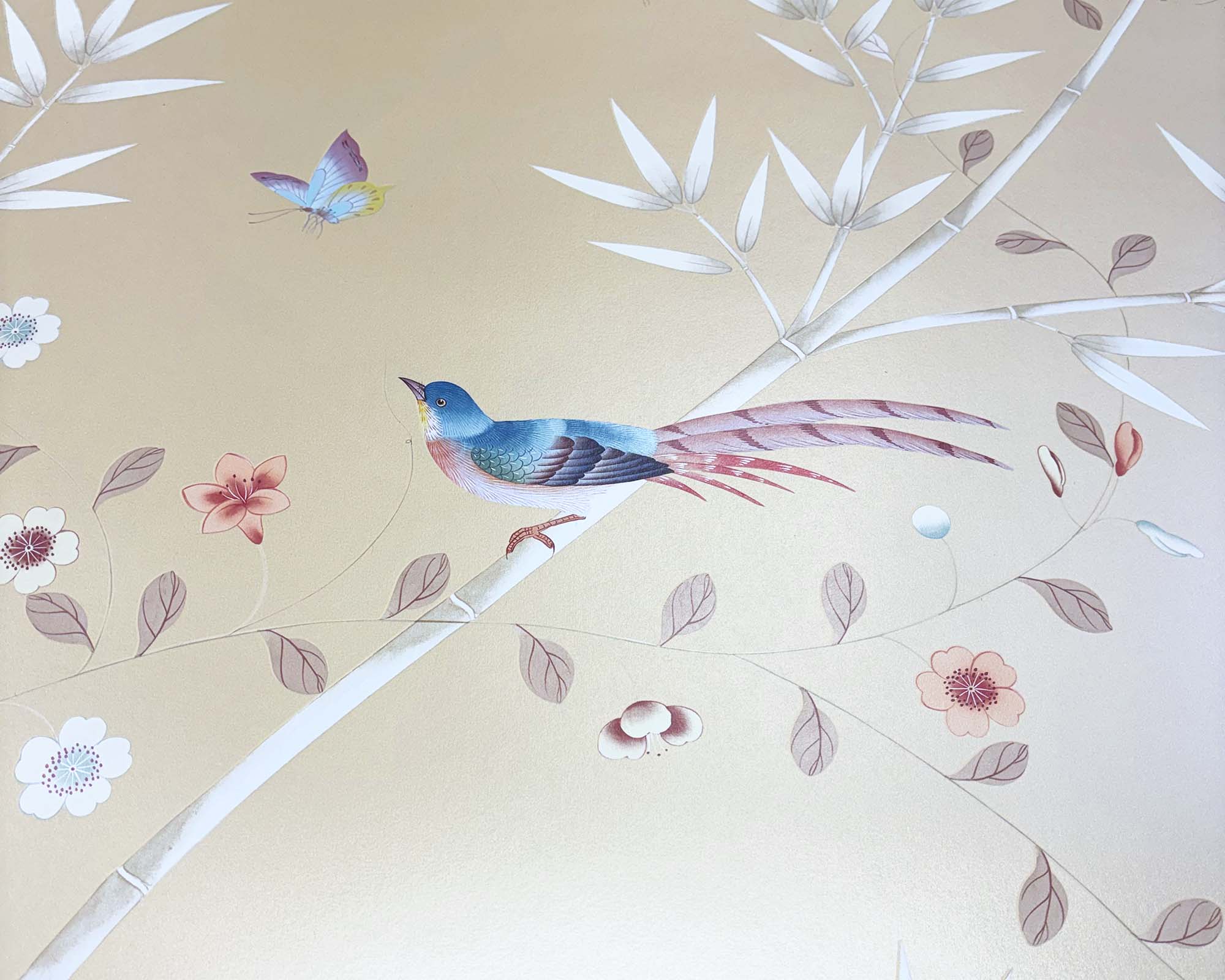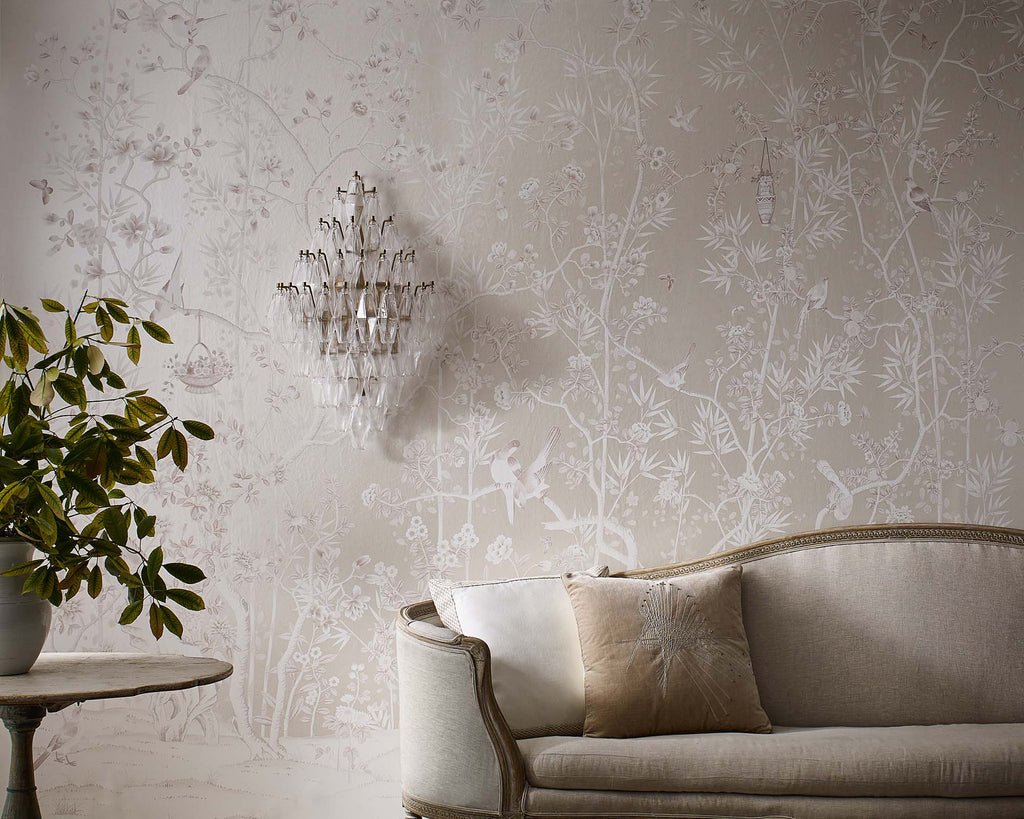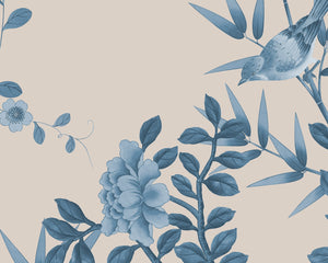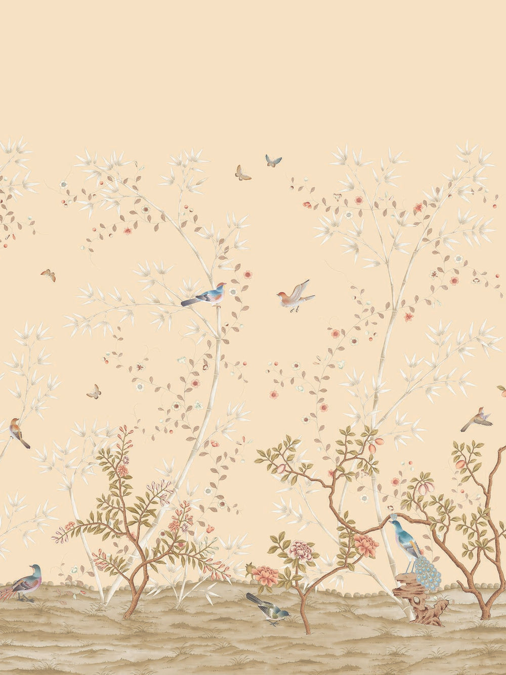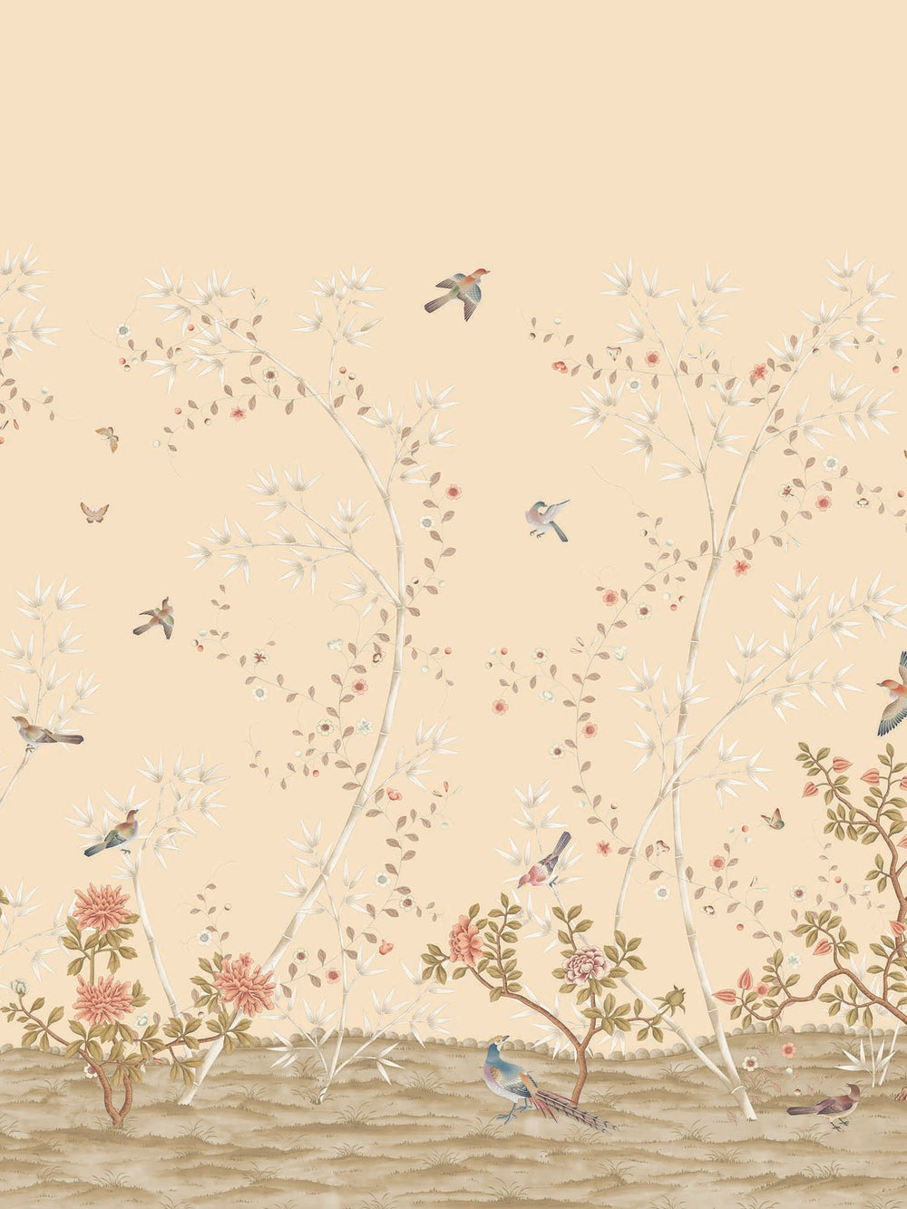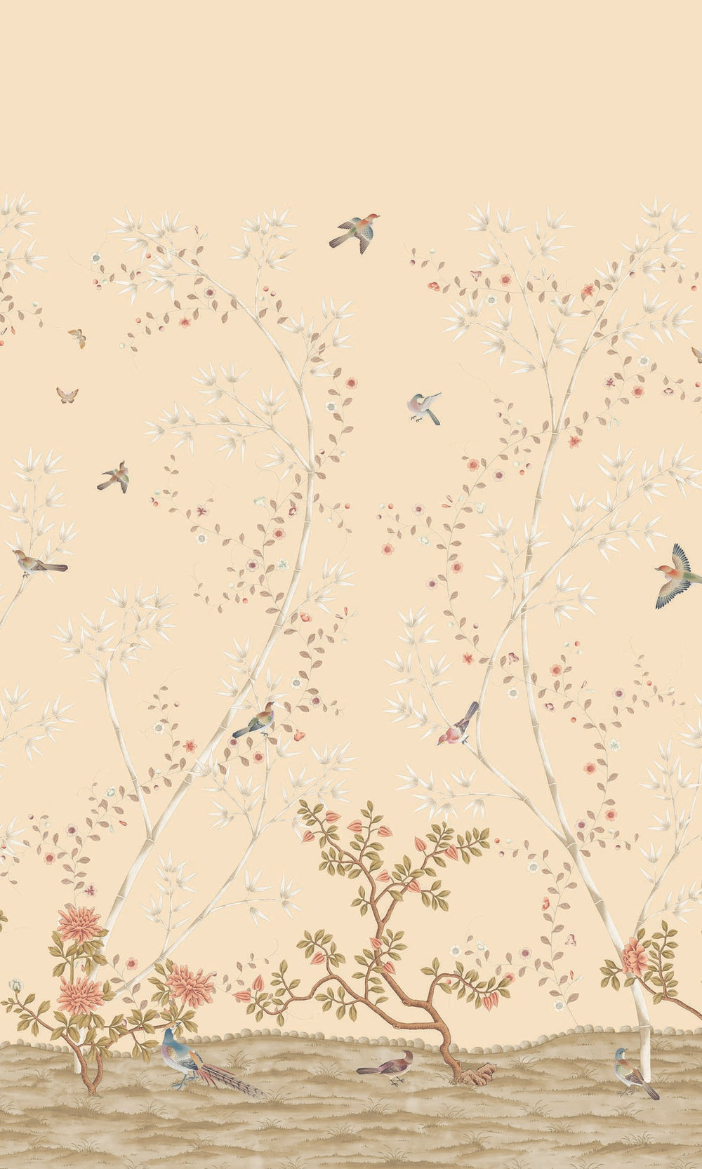Bambois is a contemporary take on Chinoiserie, where dynamic bamboo stems form a natural framework for climbing vines, unfurling peonies, birds and butterflies. This versatile design lends itself beautifully to both bright palettes and muted monochromes