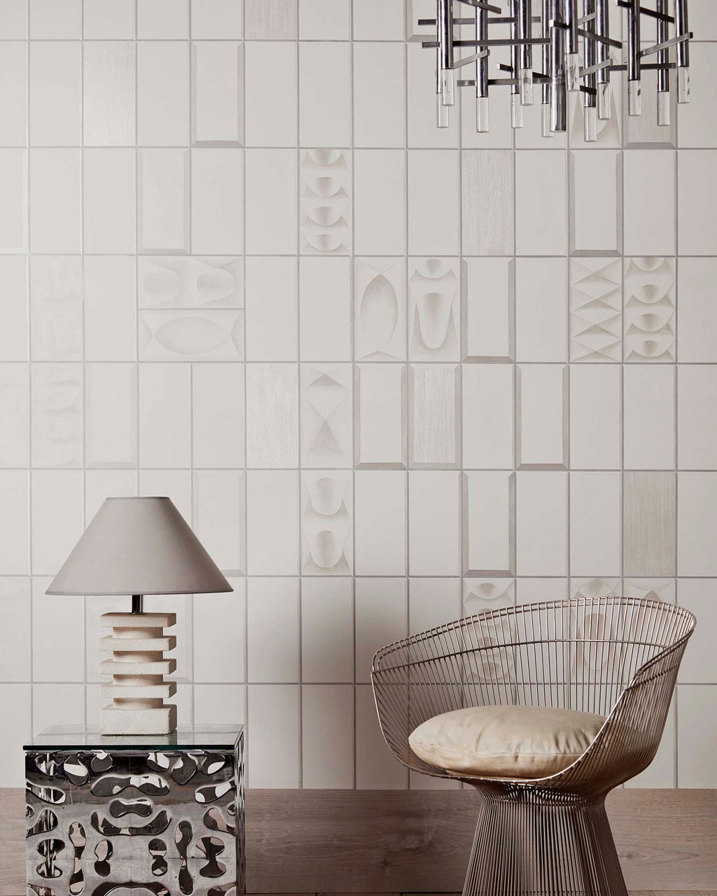 Belsize Tiles retains an industrial feel whilst also being extremely chic. Brutalist shapes are rendered in luxuriant metallic tones. This design works equally well in dramatic and subtle colour combinations.The lines and shadows create a compelling three-dimensional illusion.