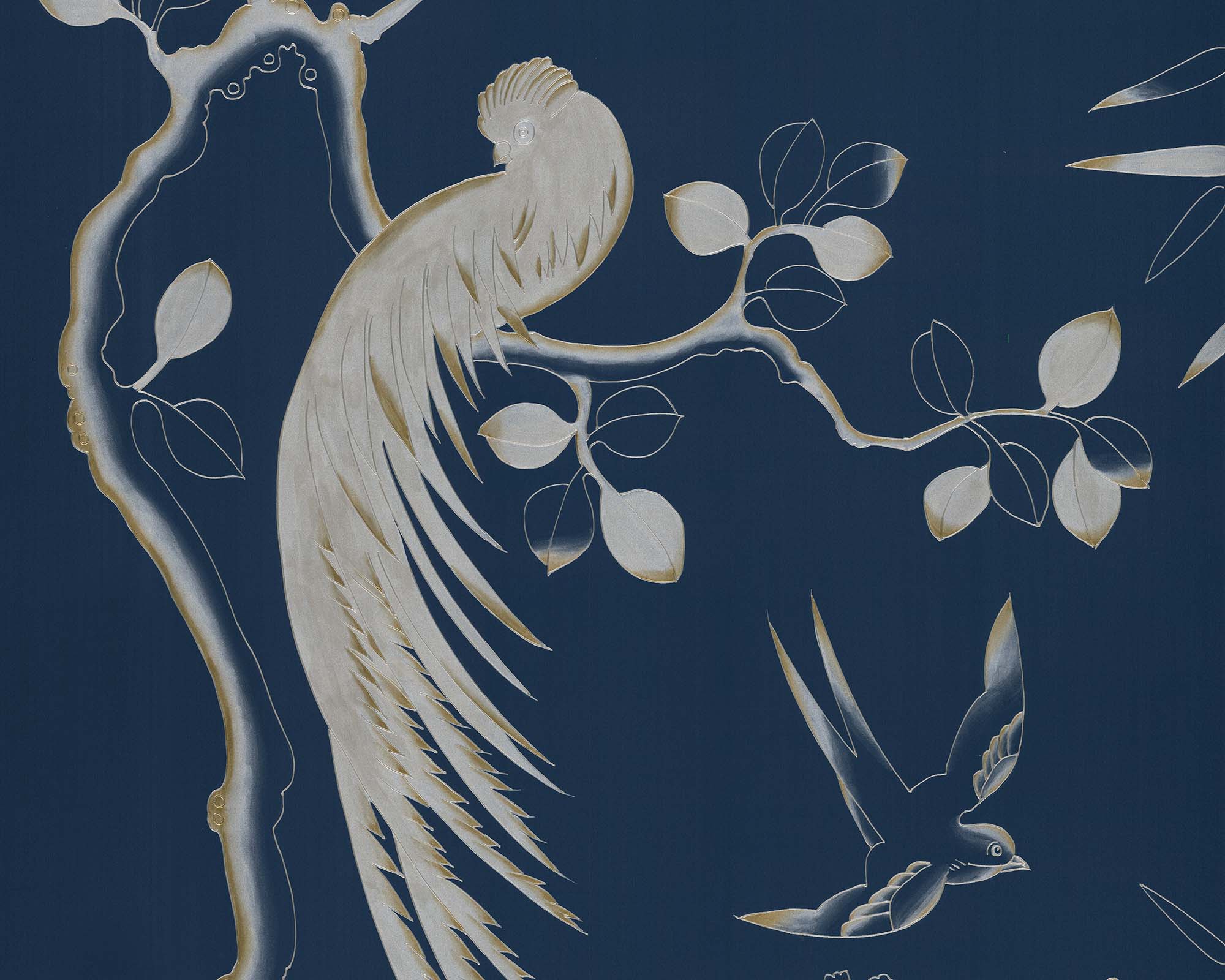 Our Chinon design in Aldrin does a marvellous job of showing off the lustre of our Bayou Blue Silk. Contrasting tones of platinum and gold in the painted detail make for a powerful statement.