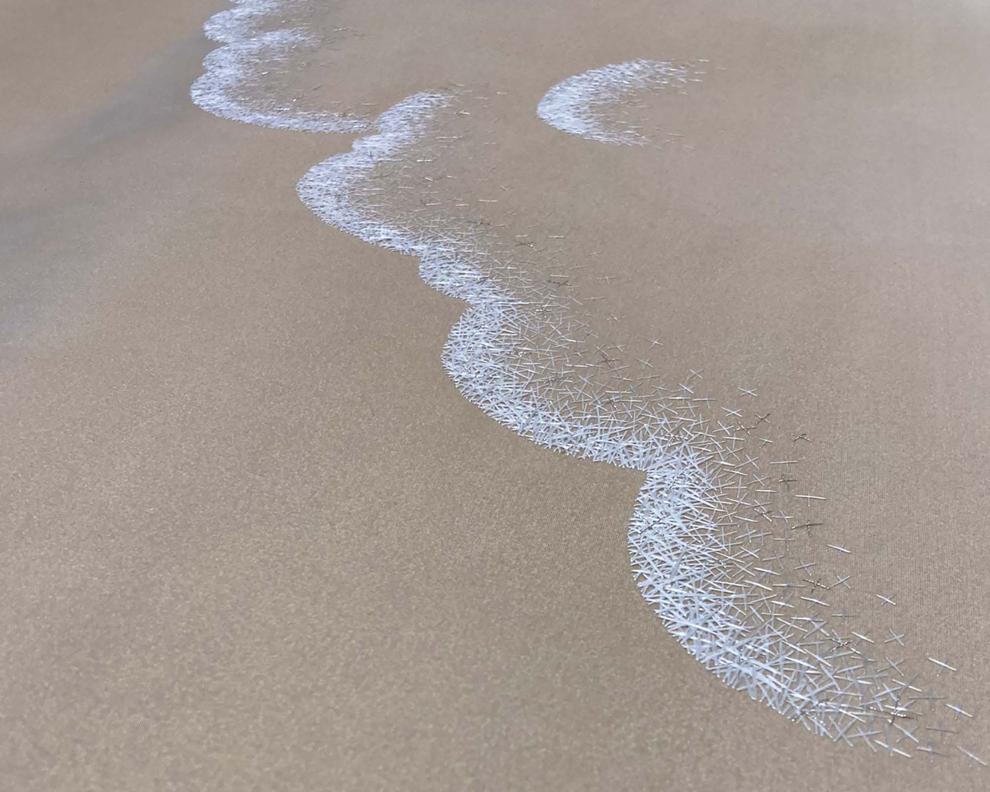 A minimalist cloudscape set across a soft silk ground; clouds highlighted with cross-stitch embroidery to show where the sunlight might hit them.