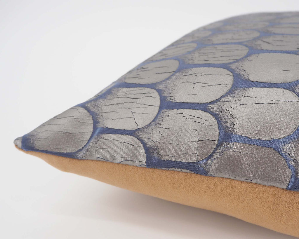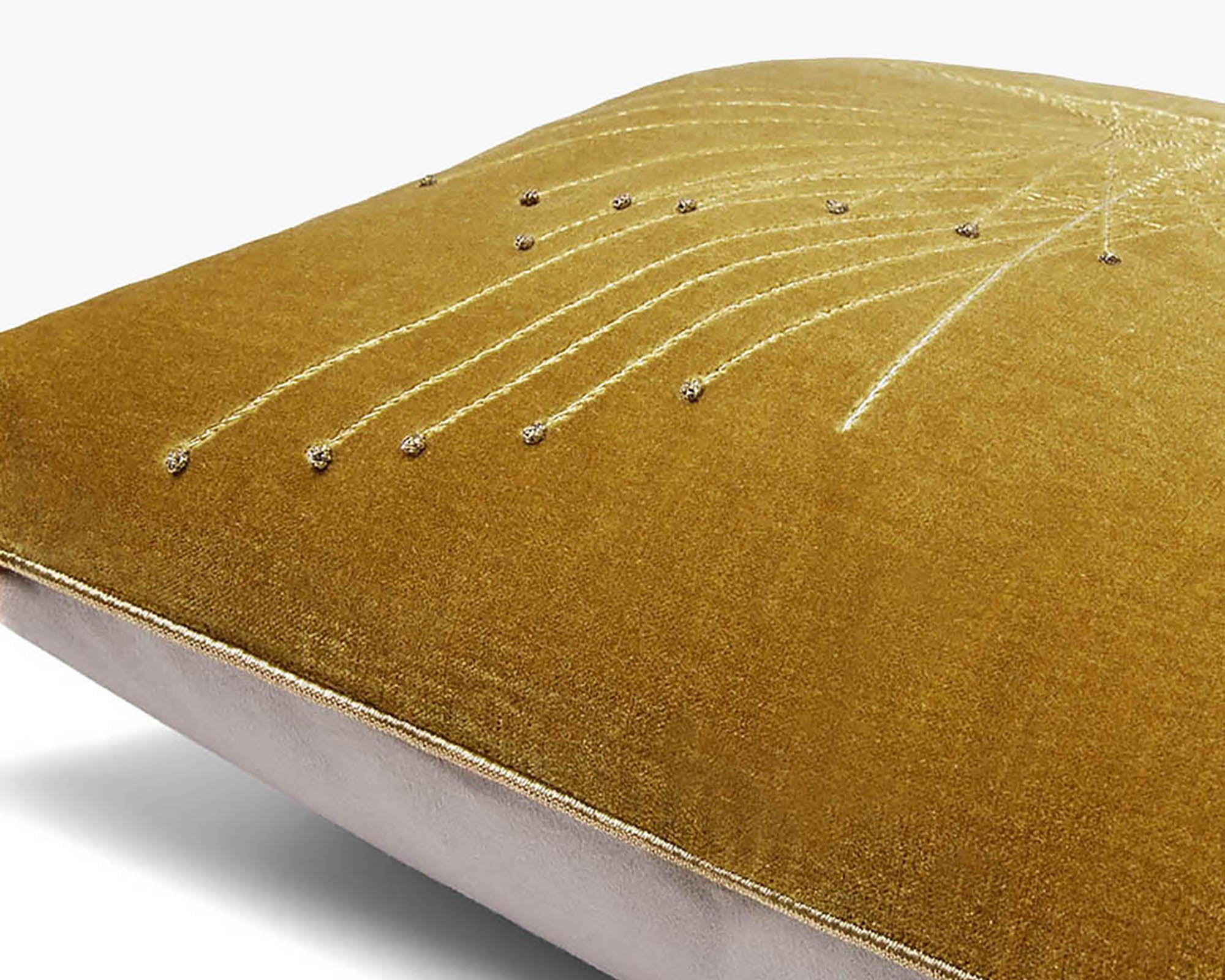 Our Construct cushion is inspired by their screw mobile structures, which featured long metal rods that created sweeping fans of light. With our cushion, these geometric forms are hand-rendered using a mixture of metallic embroidery threads on a velvet background.