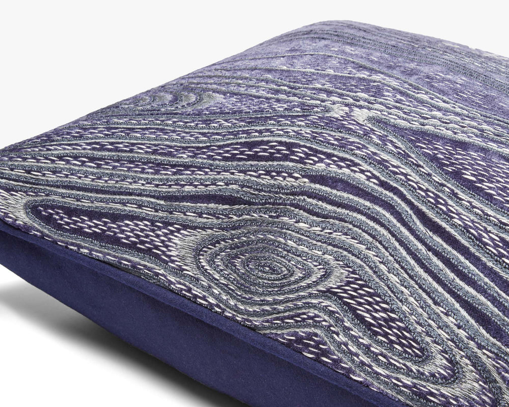 Our Construct cushion is inspired by their screw mobile structures, which featured long metal rods that created sweeping fans of light. With our cushion, these geometric forms are hand-rendered using a mixture of metallic embroidery threads on a velvet background.