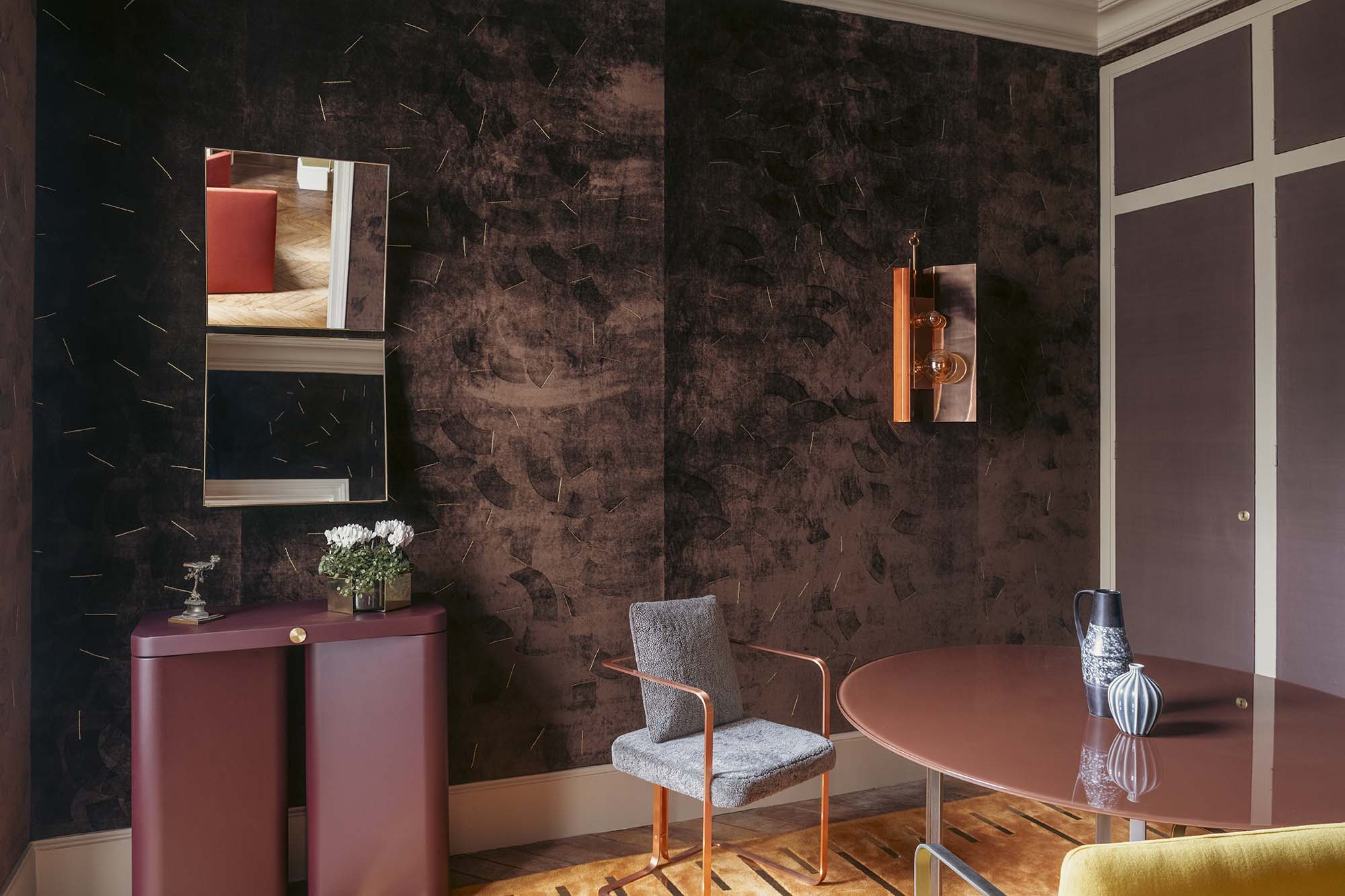 Available in four colourways, each one named after a horse coat colour, Equus showcases the opulent nature and textural possibilities of fine Italian velvet. In our dark brown Italian Velvet, Bay captures the light to reveal an array of rich tones and features gold embroidery.