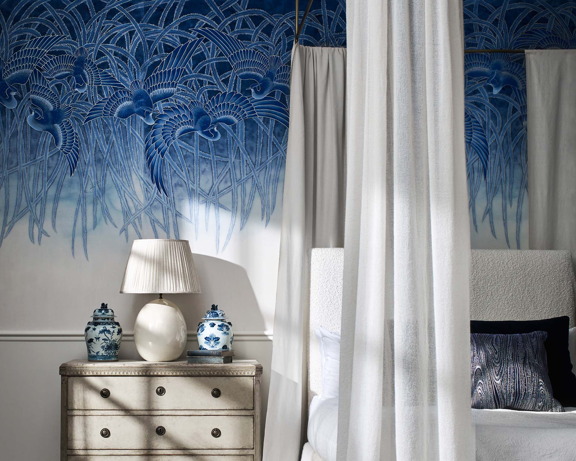 Hand-painted onto a backing of fine white silk, Bleu’s soft, monochrome palette takes in an array of tones, from indigo and midnight to steel and duck egg.