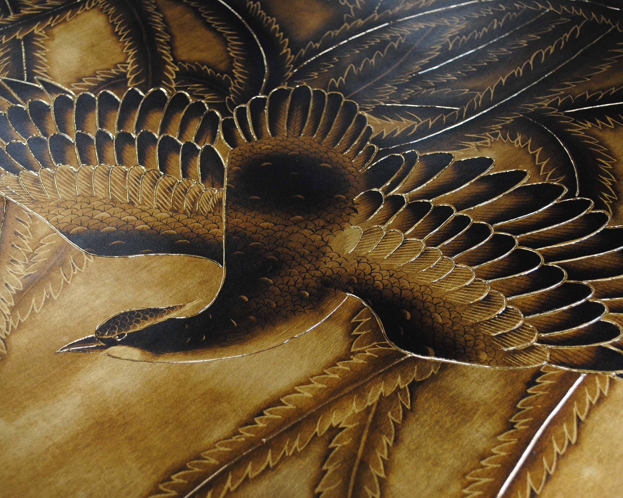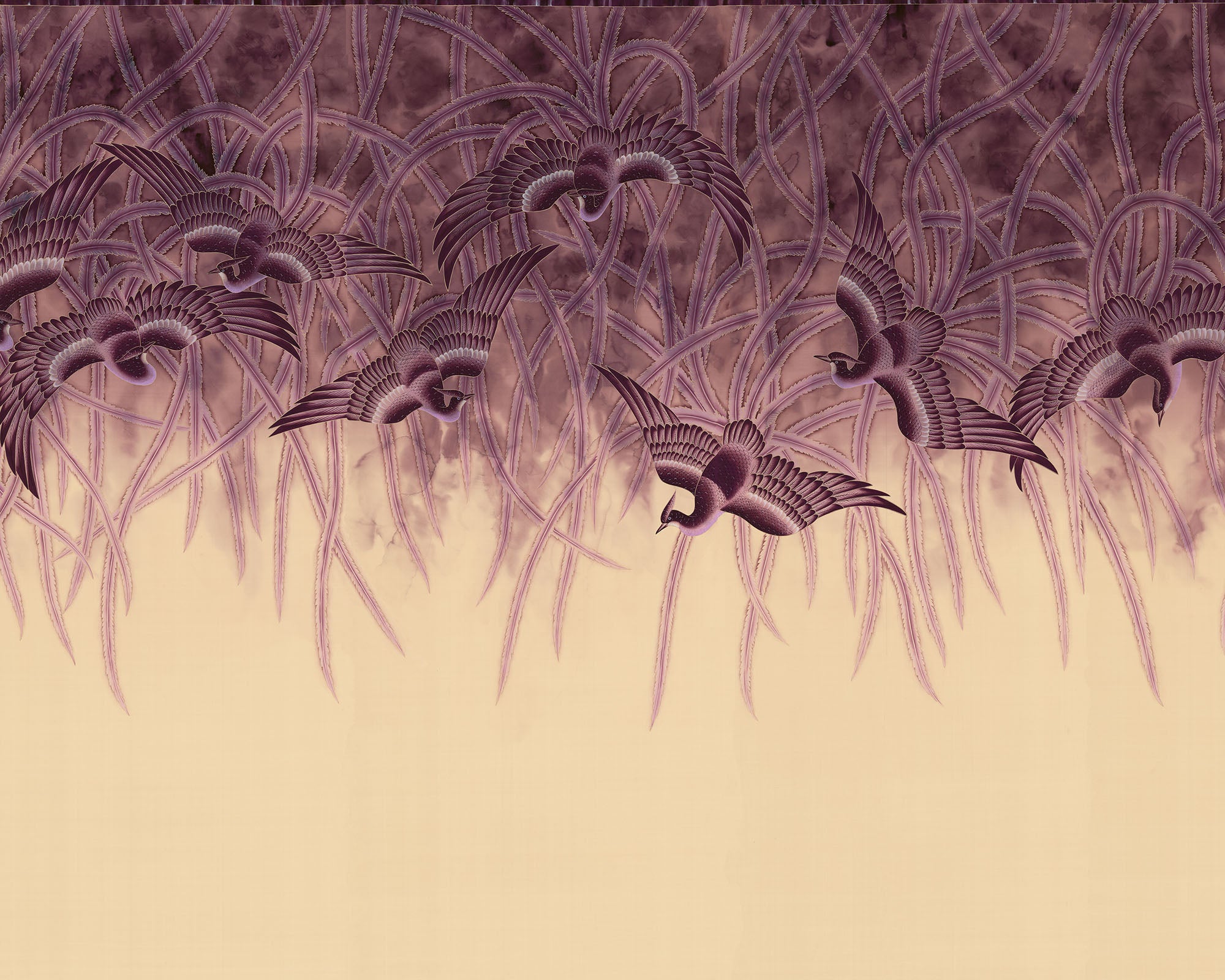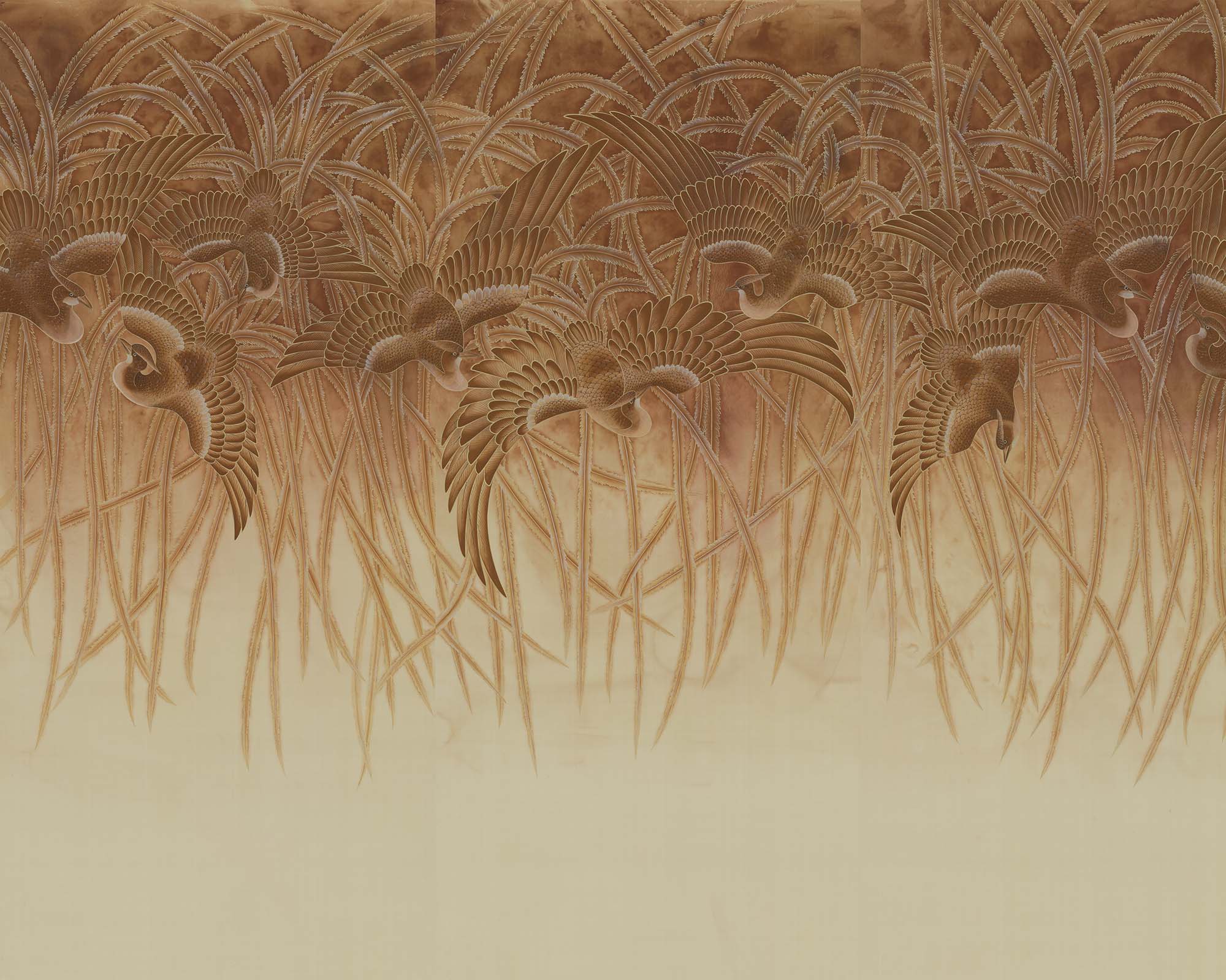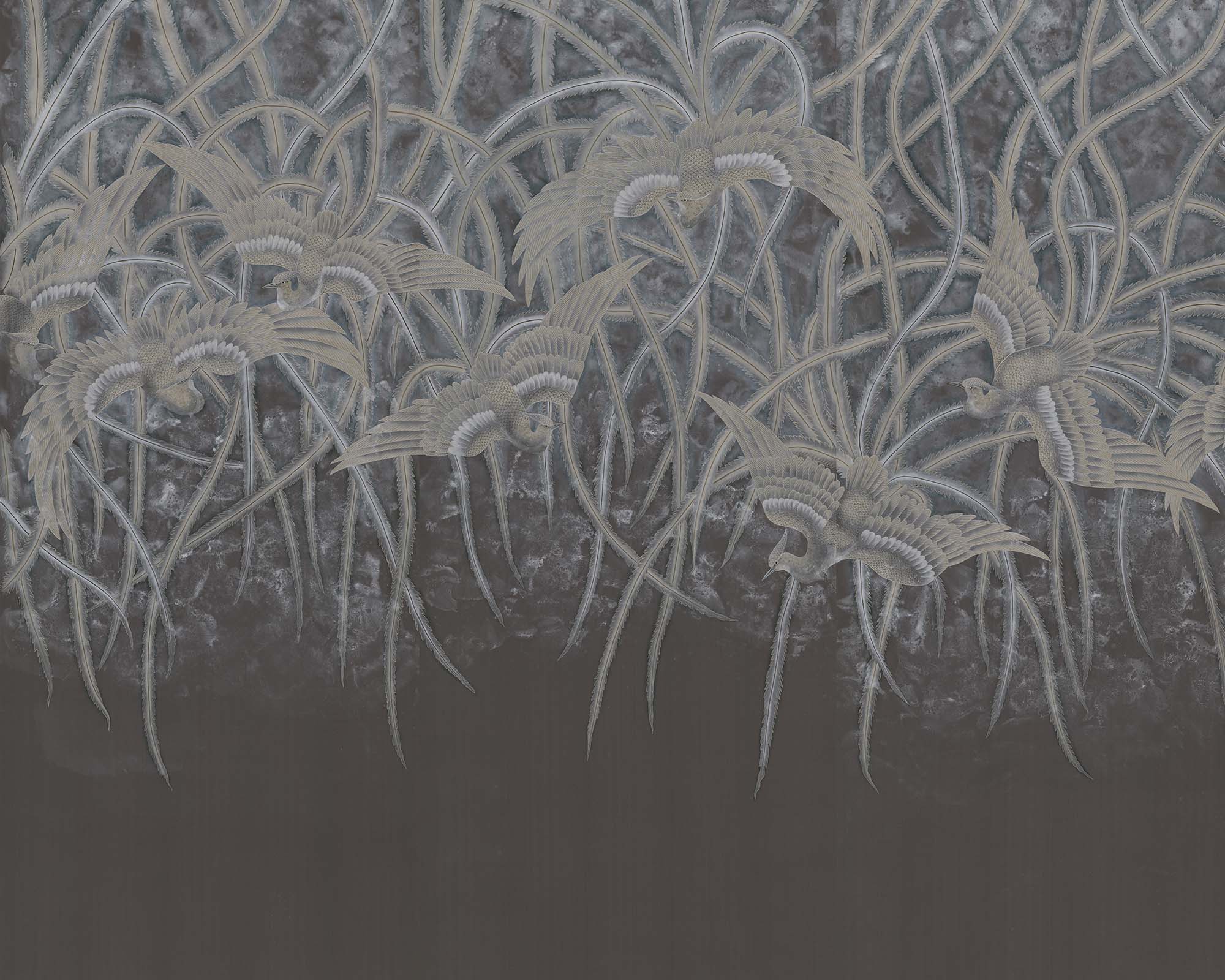 Meticulously rendered pheasants dance across the design, their long tail plumes cascading downwards, evoking a sense of movement and grace. Monochrome palettes and witty use of the ombré effect bring to mind Lalique’s fine glassware with its exquisite frosting and staining.