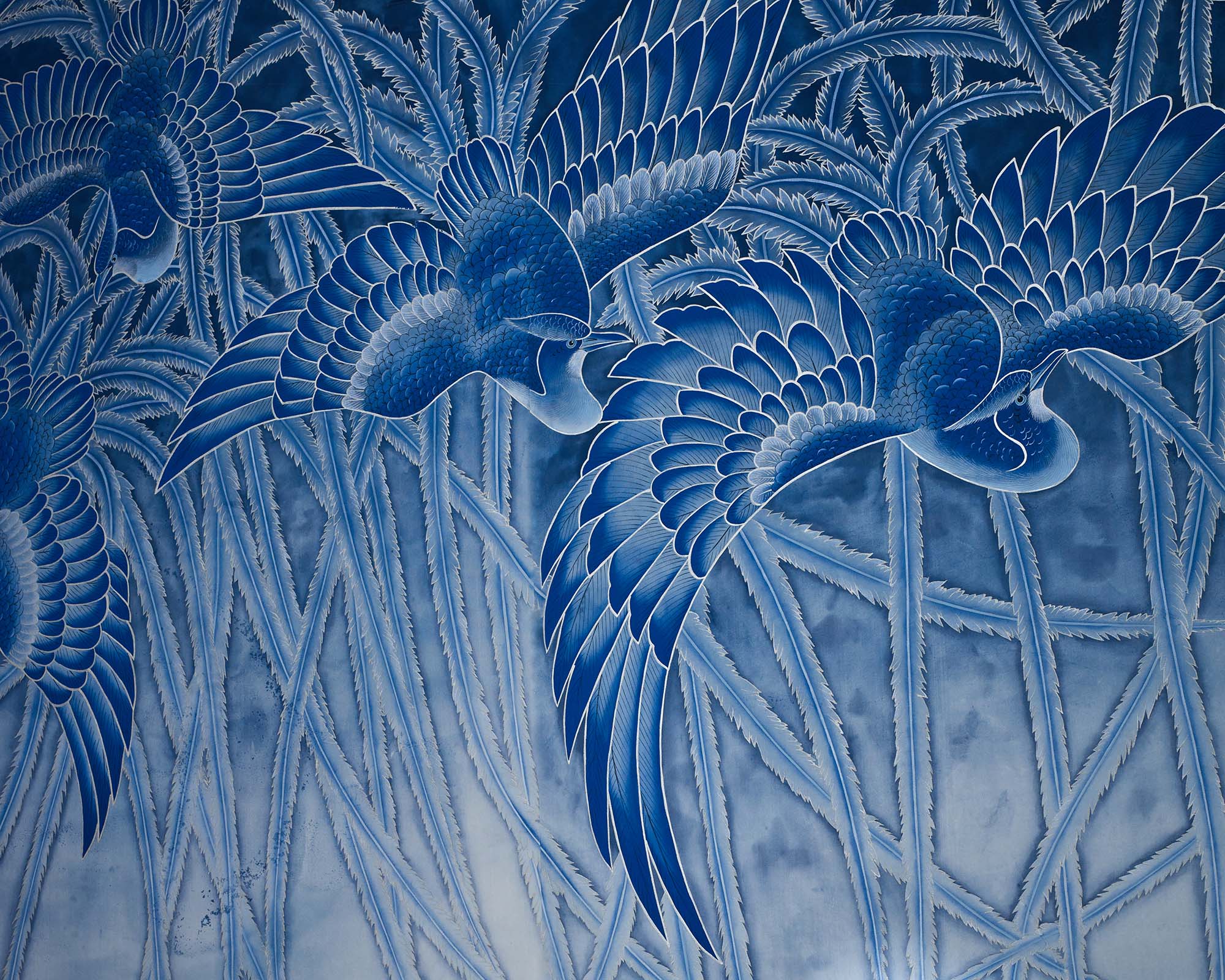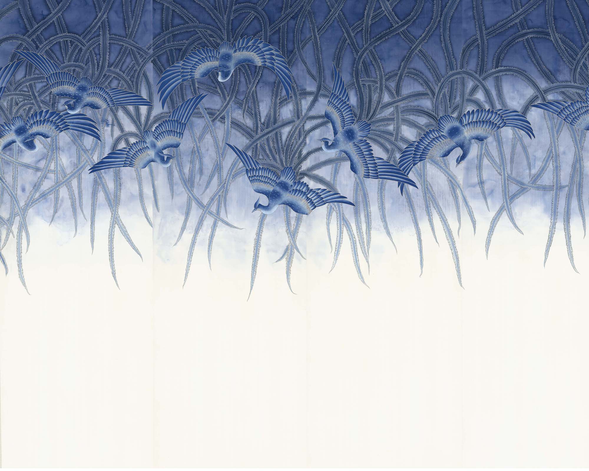 Hand-painted onto a backing of fine white silk, Bleu’s soft, monochrome palette takes in an array of tones, from indigo and midnight to steel and duck egg.