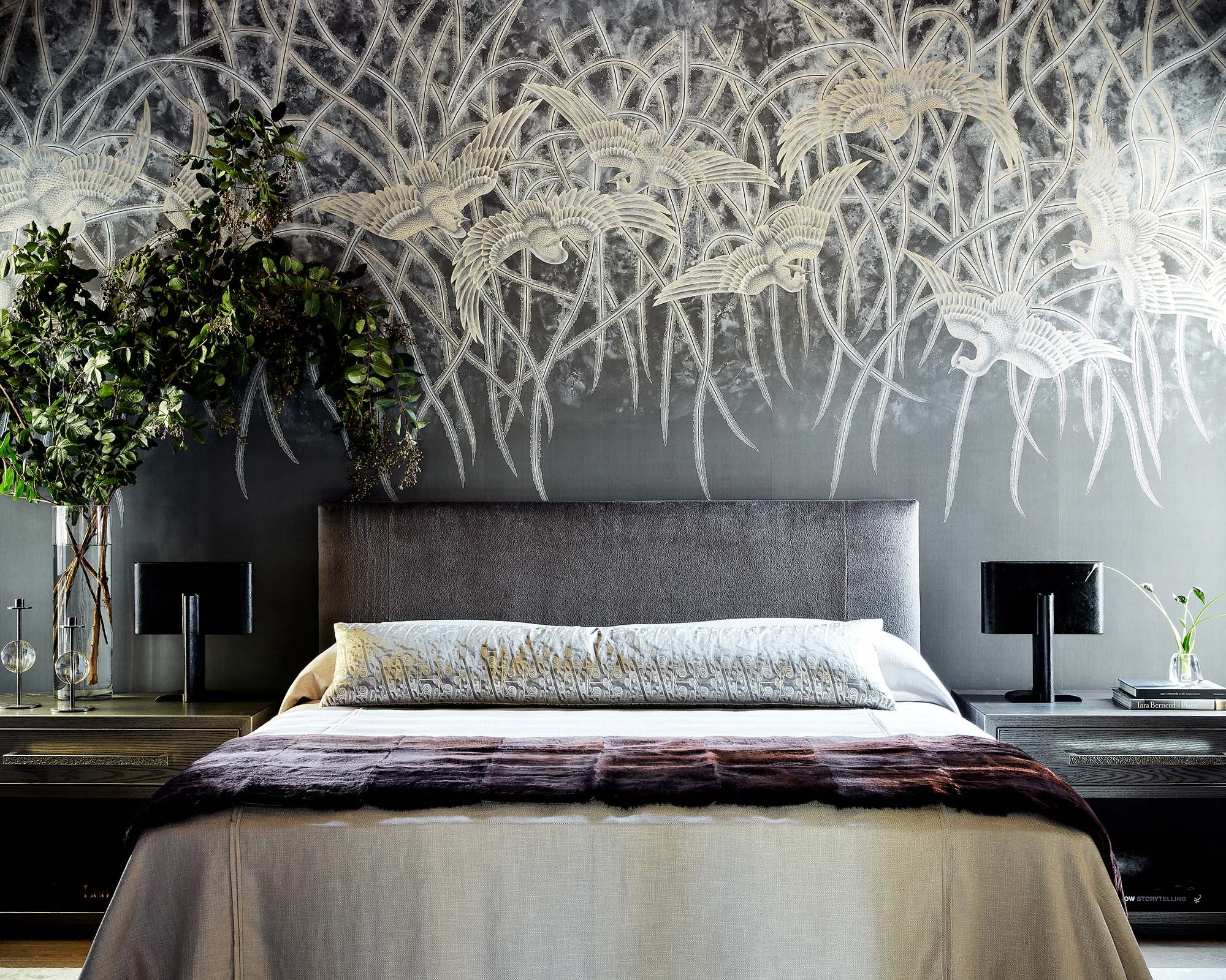 Meticulously rendered pheasants dance across the design, their long tail plumes cascading downwards, evoking a sense of movement and grace. Monochrome palettes and witty use of the ombré effect bring to mind Lalique’s fine glassware with its exquisite frosting and staining.