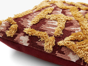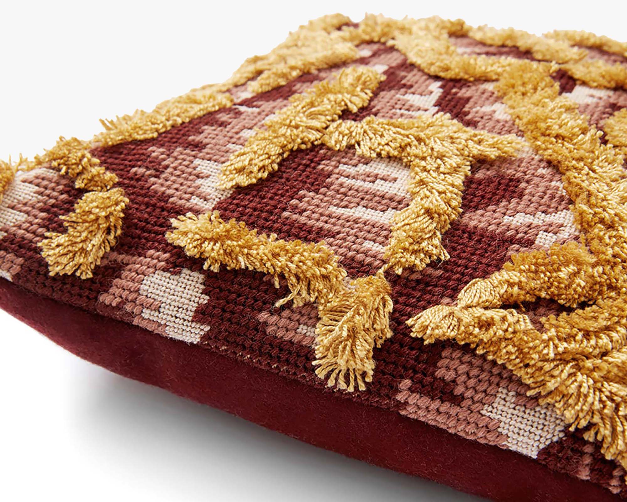 Maroon has oversized gold detailing rendered in rayon Surrey stitch which contrasts dramatically with a background made up of pale pink, dark pink and maroon wool.