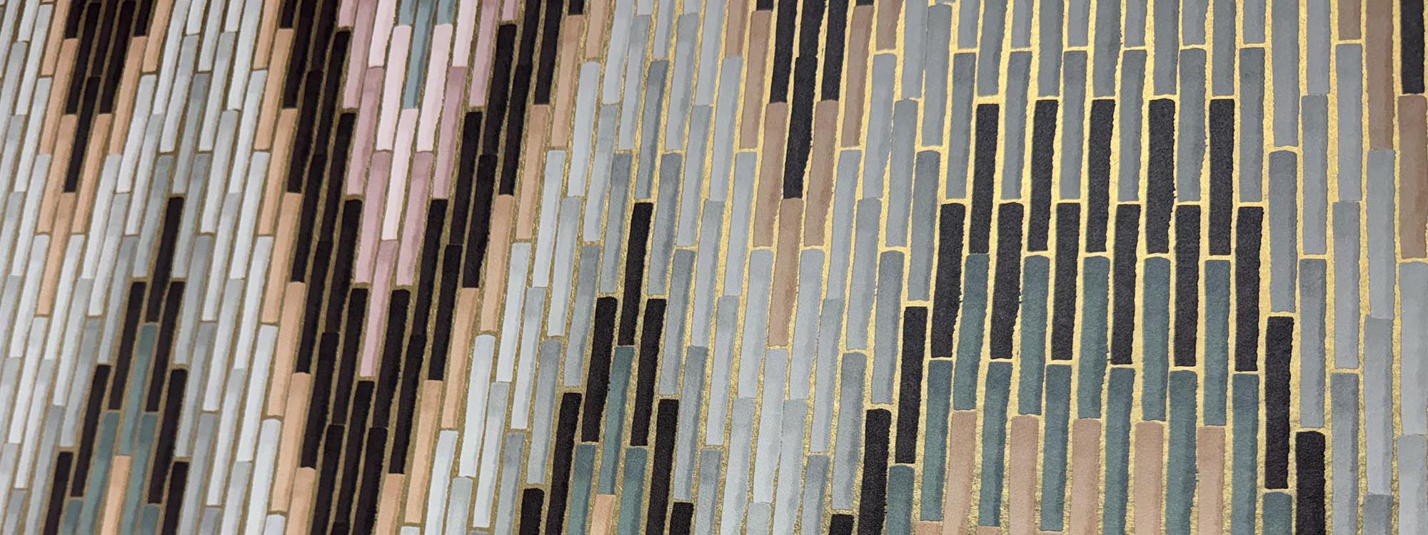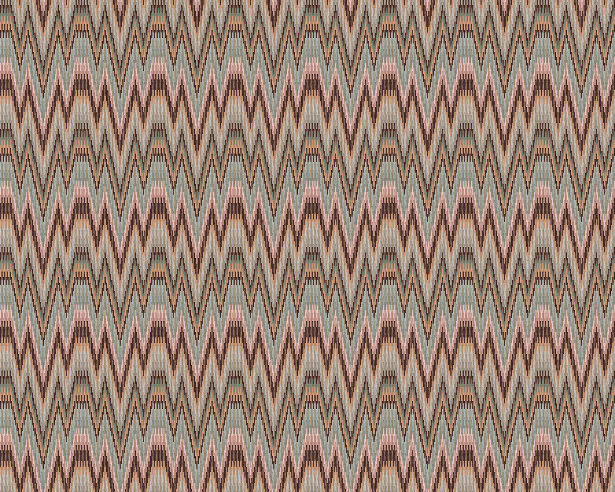• Through the centuries, flame stitch – in its various shapes, scales and colours – has been expressed in many mediums, from embroidery to needlepoint. It has always injected a flamboyant and dynamic visual punch to an interior. We have reinterpreted this fabric, a joyful renaissance favourite, as a vibrant and modern wallcovering, using hundreds of brushstrokes to mimic the individual stitches. Rendered in print, the design is then hand brushed with a gloss finish for added depth and lustre.