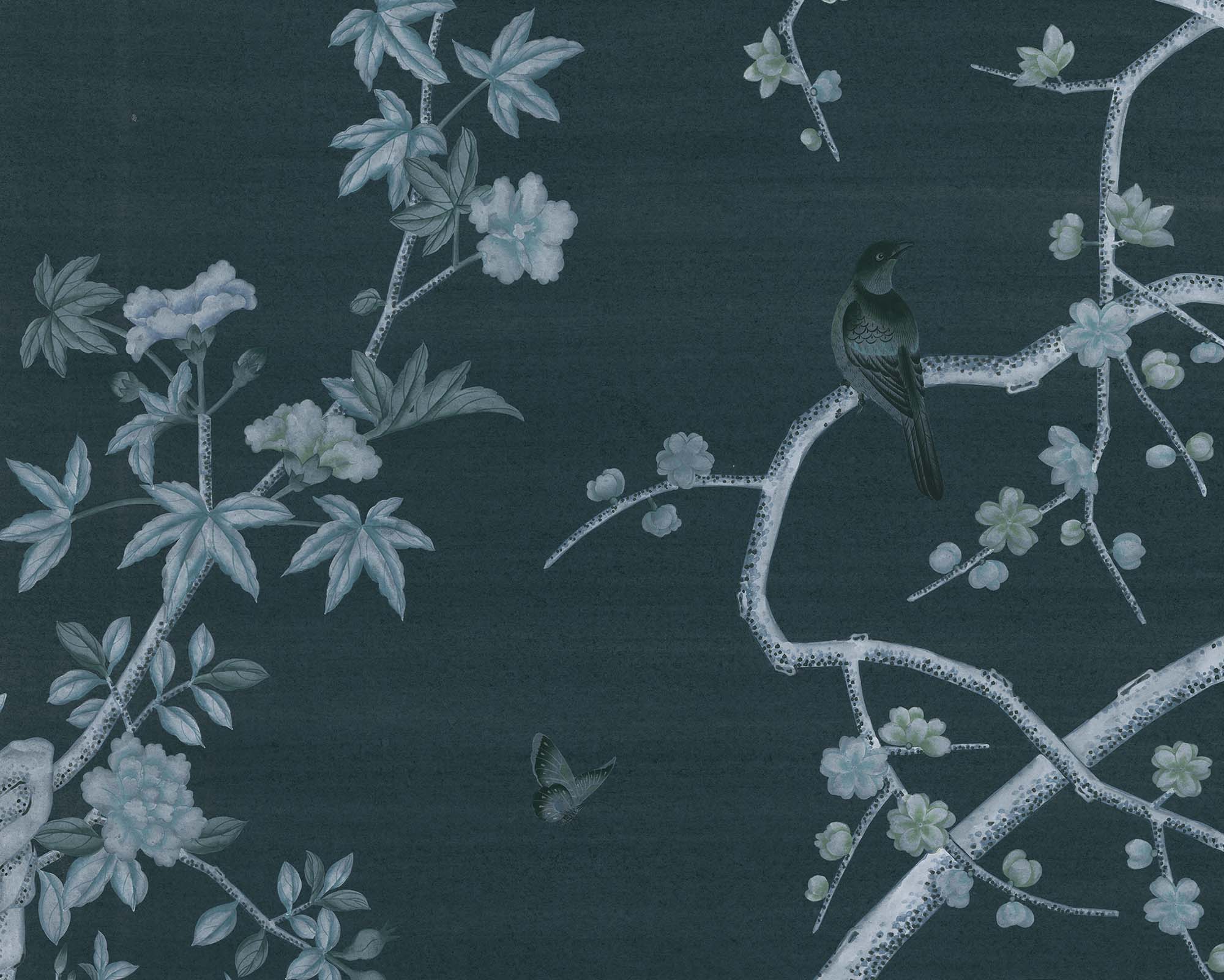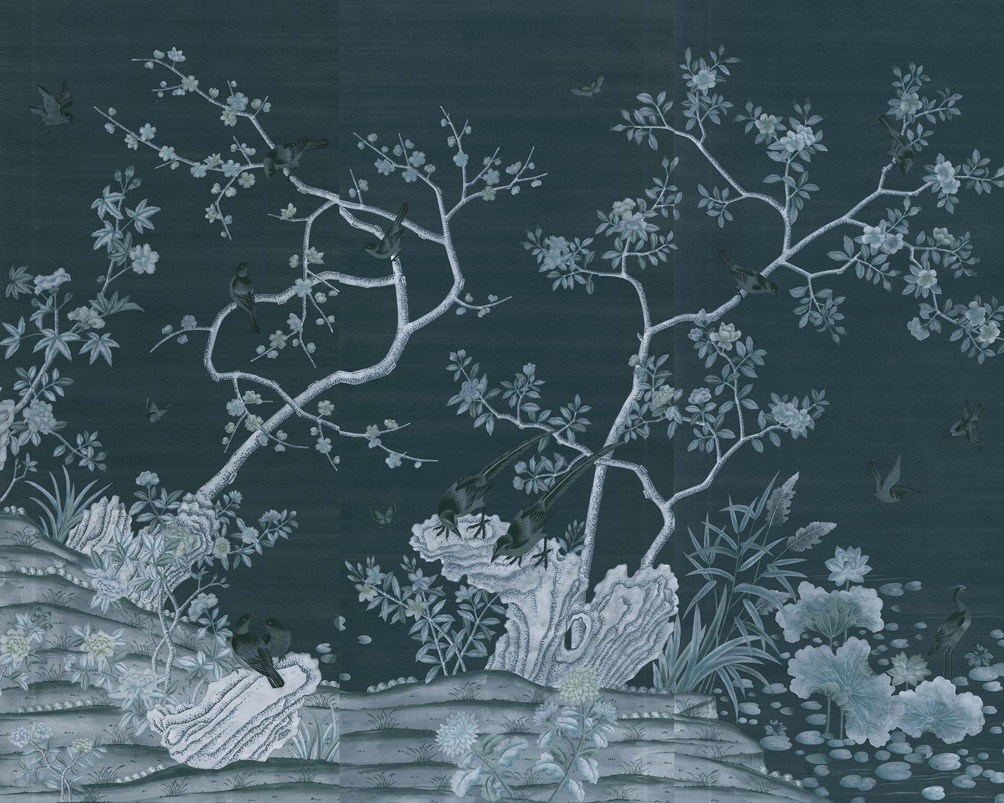 Our Folly design layout is at once bold, classical and whimsical. The scene moves between rocks, water and lush foliage, with beautiful birds throughout. With quite a dense layout and a deep, heavy ground comprising both land and water, the feeling is that of being immersed in a botanical paradise.