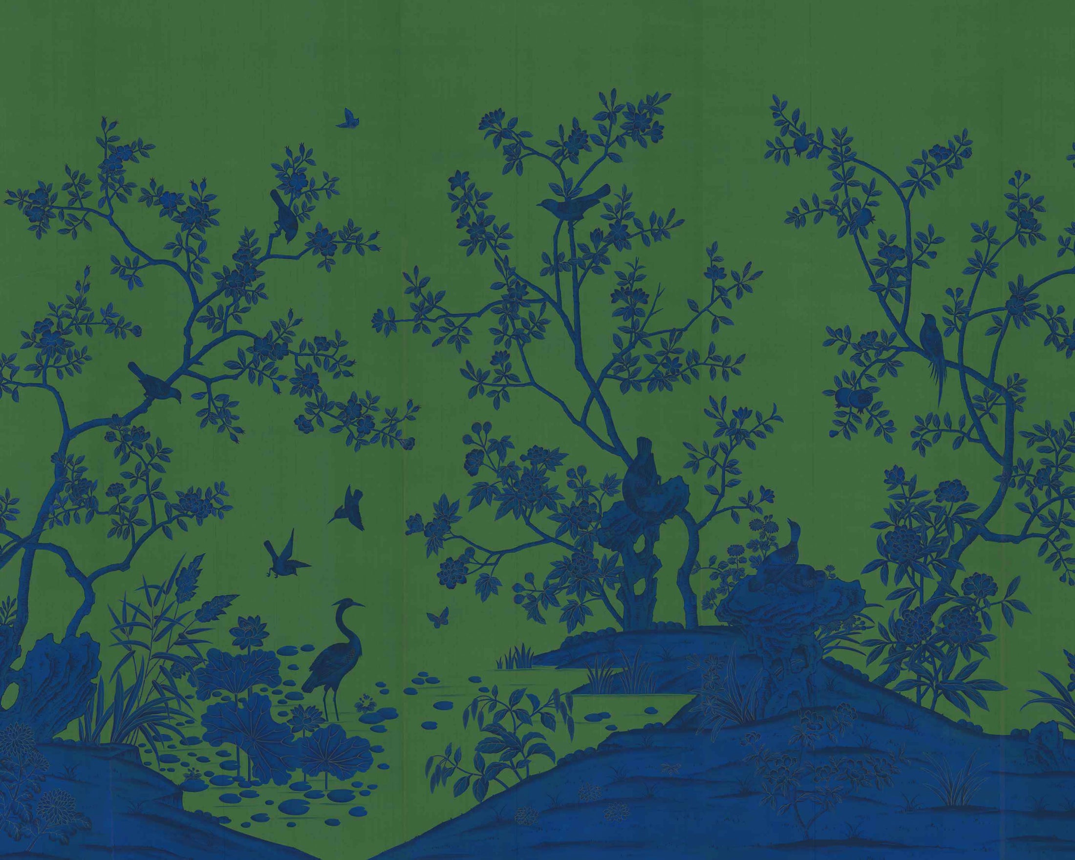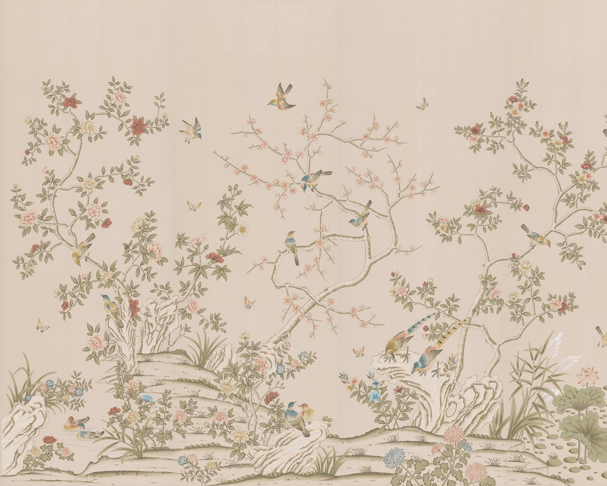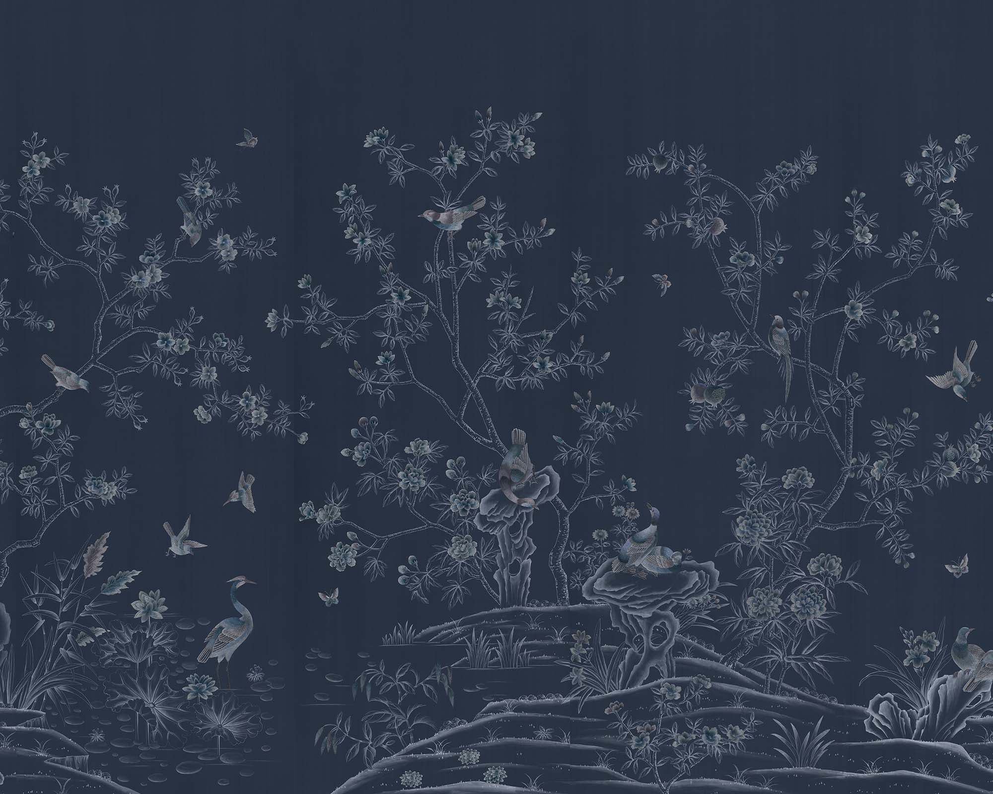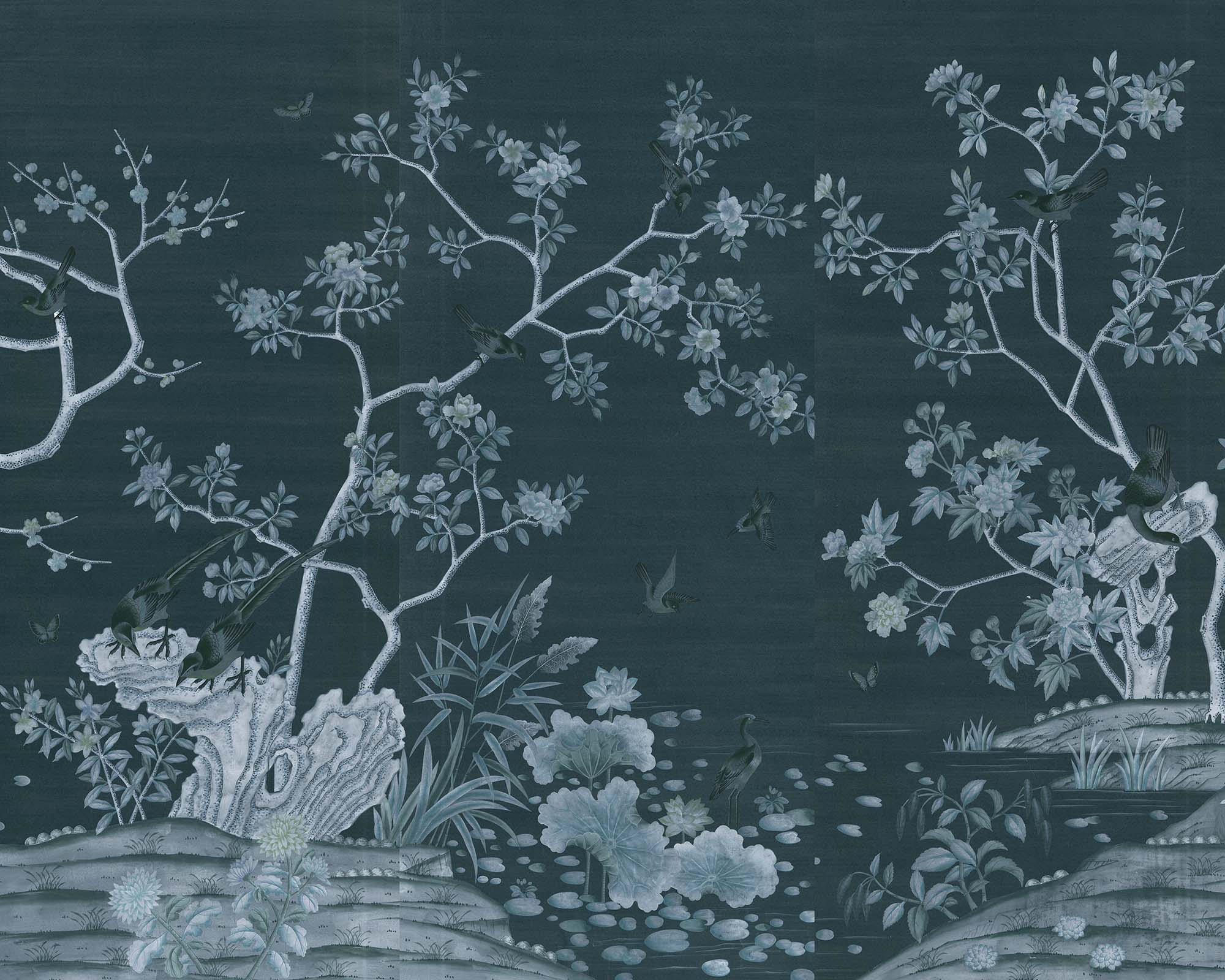 Our Folly design layout is at once bold, classical and whimsical. The scene moves between rocks, water and lush foliage, with beautiful birds throughout. With quite a dense layout and a deep, heavy ground comprising both land and water, the feeling is that of being immersed in a botanical paradise.