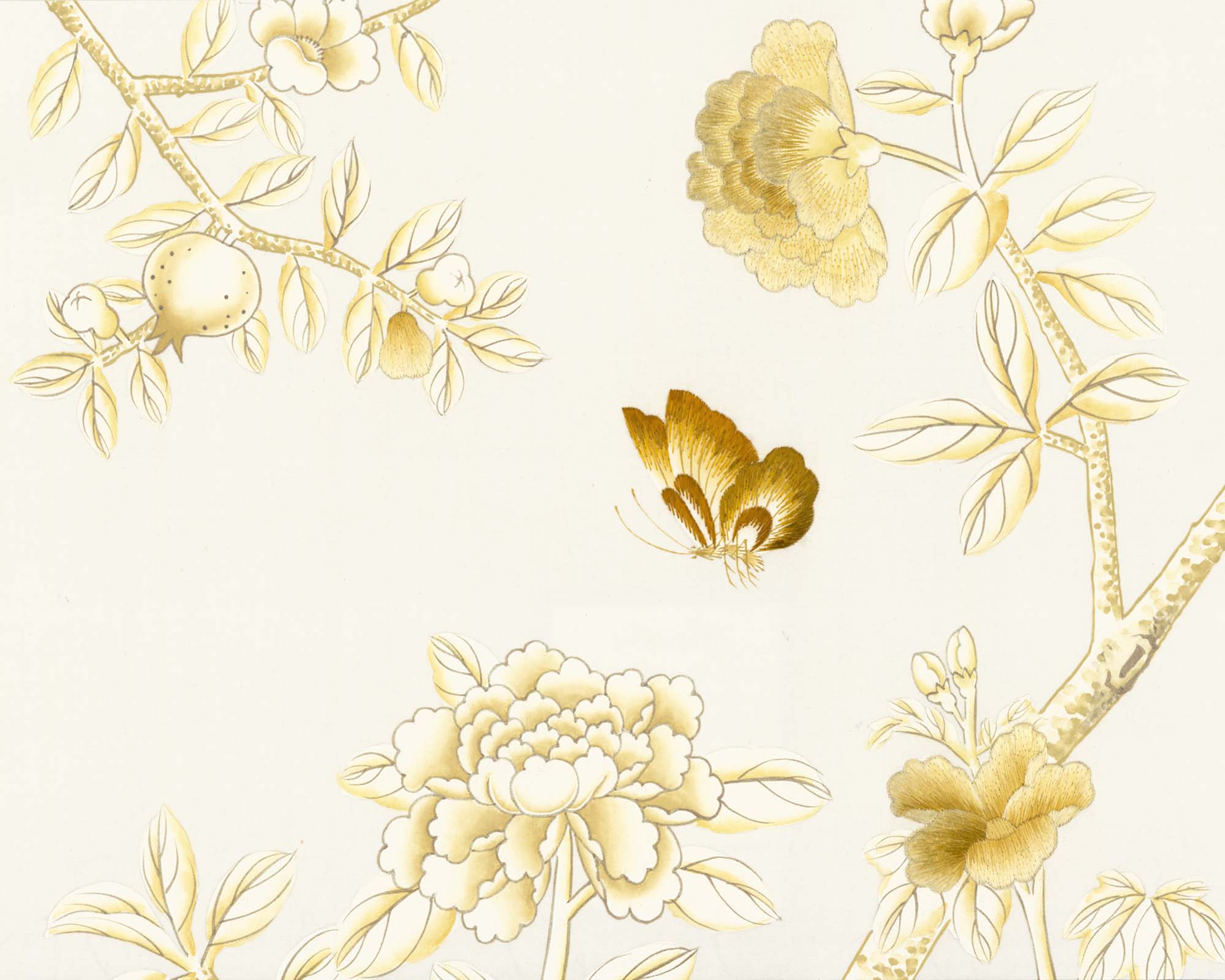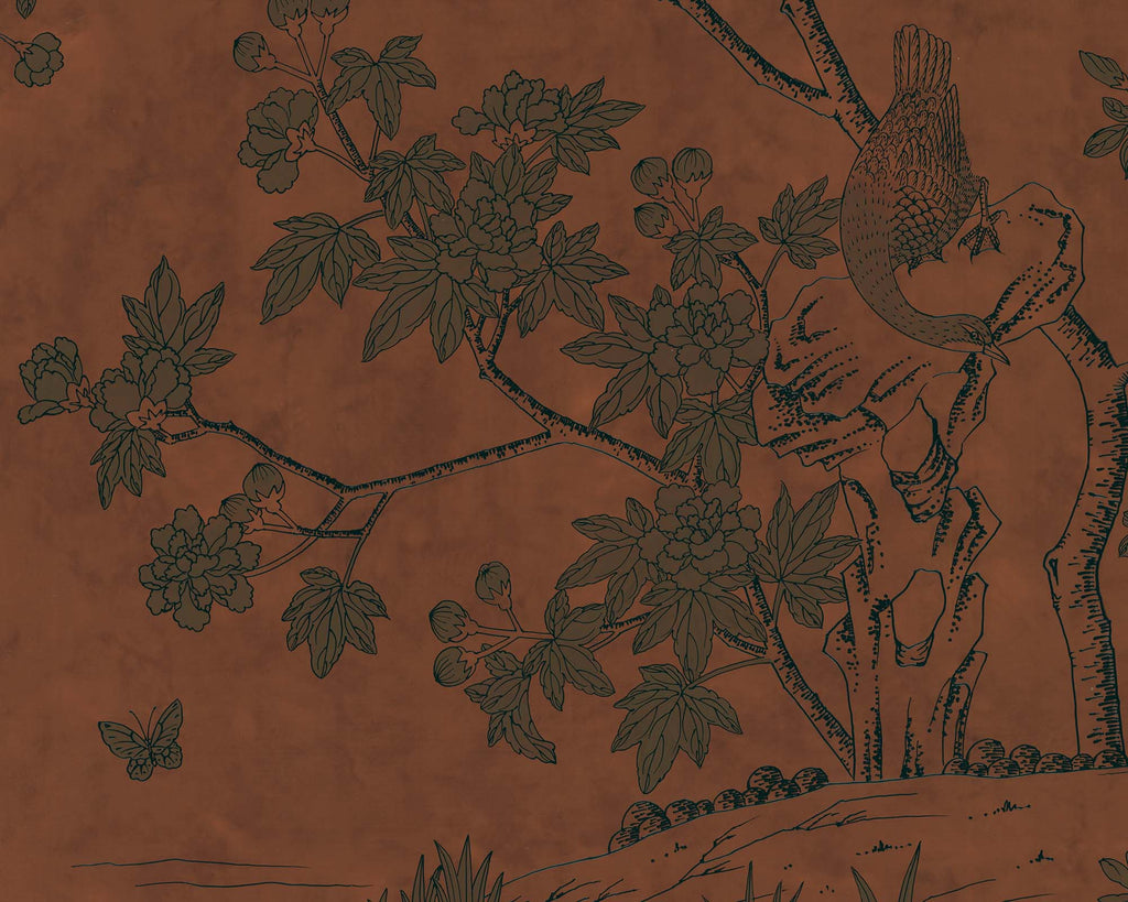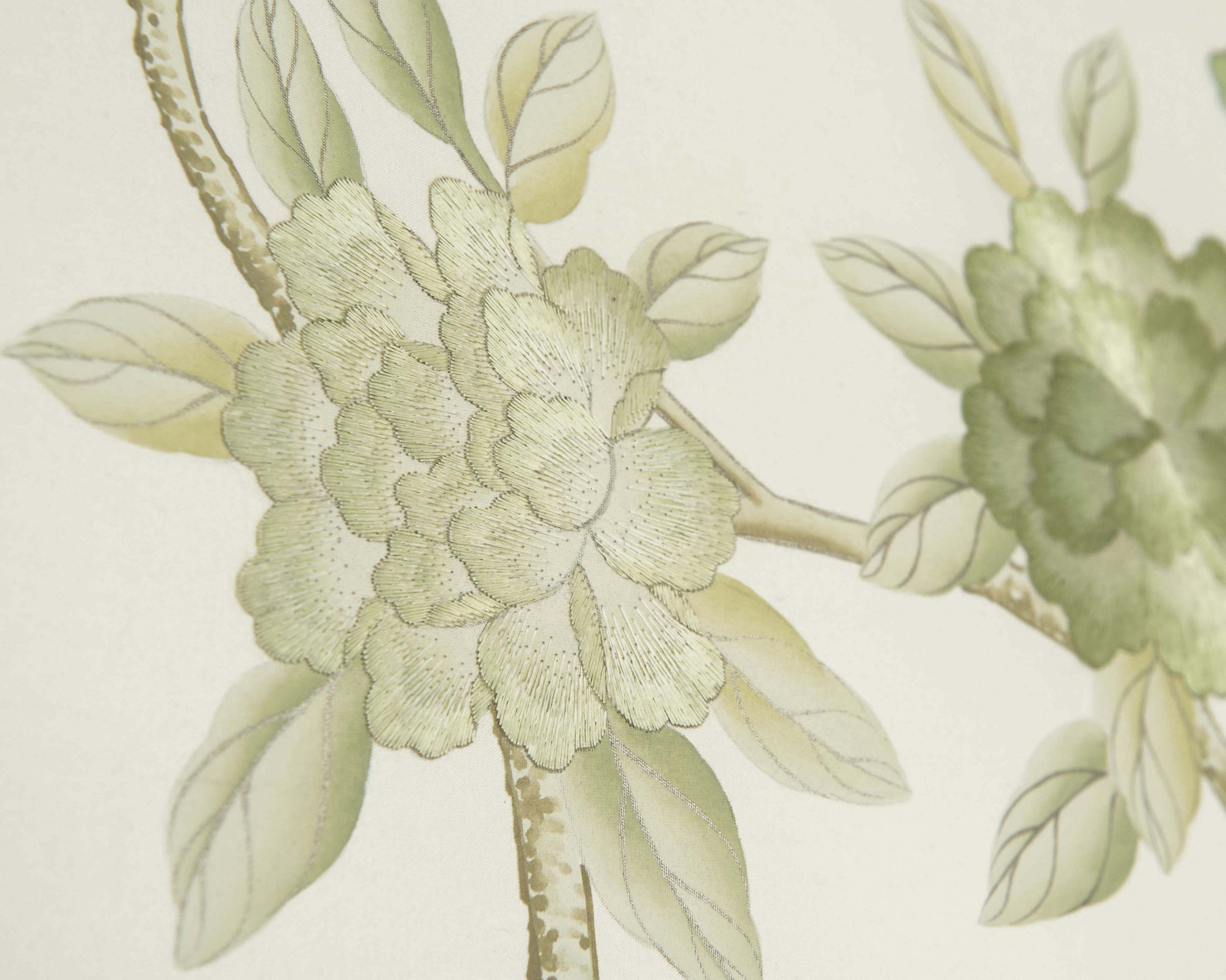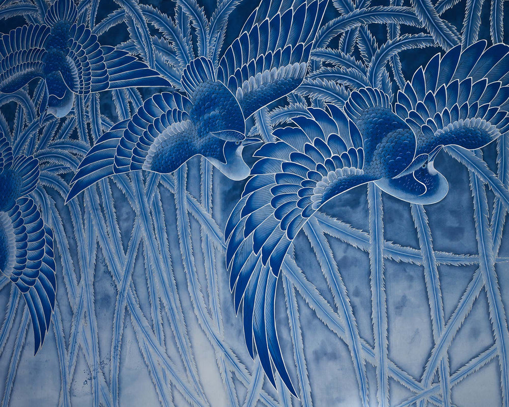 Our Folly design layout is at once bold, classical and whimsical. The scene moves between rocks, water and lush foliage, with beautiful birds throughout. With quite a dense layout and a deep, heavy ground comprising both land and water, the feeling is that of being immersed in a botanical paradise.