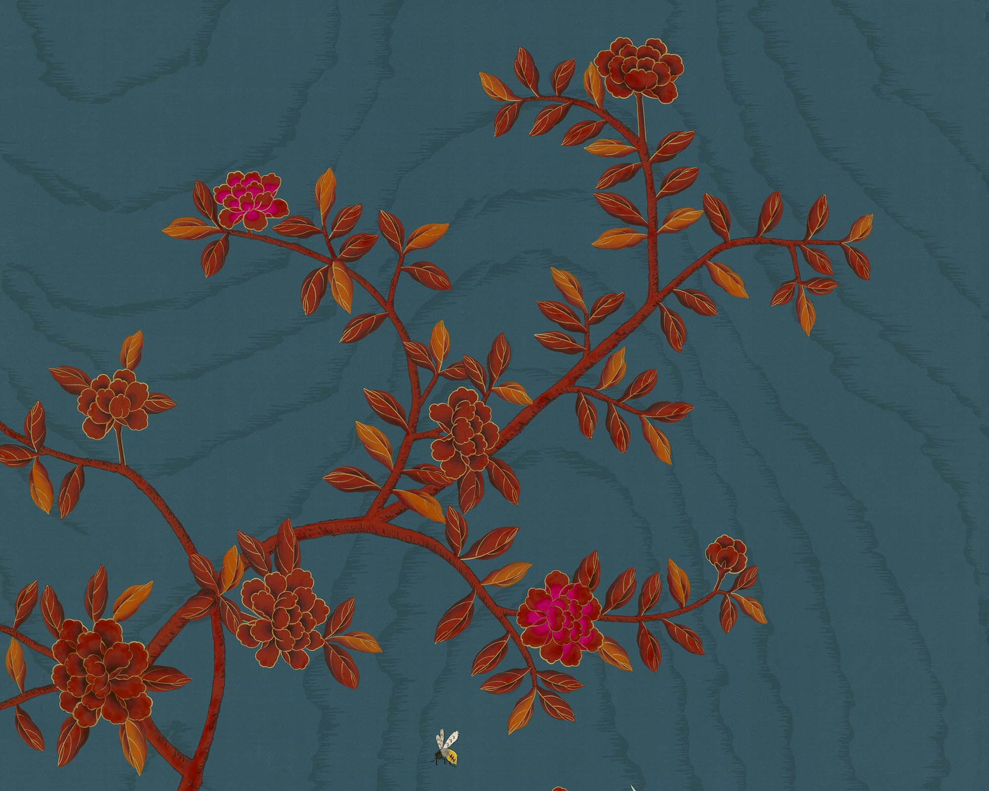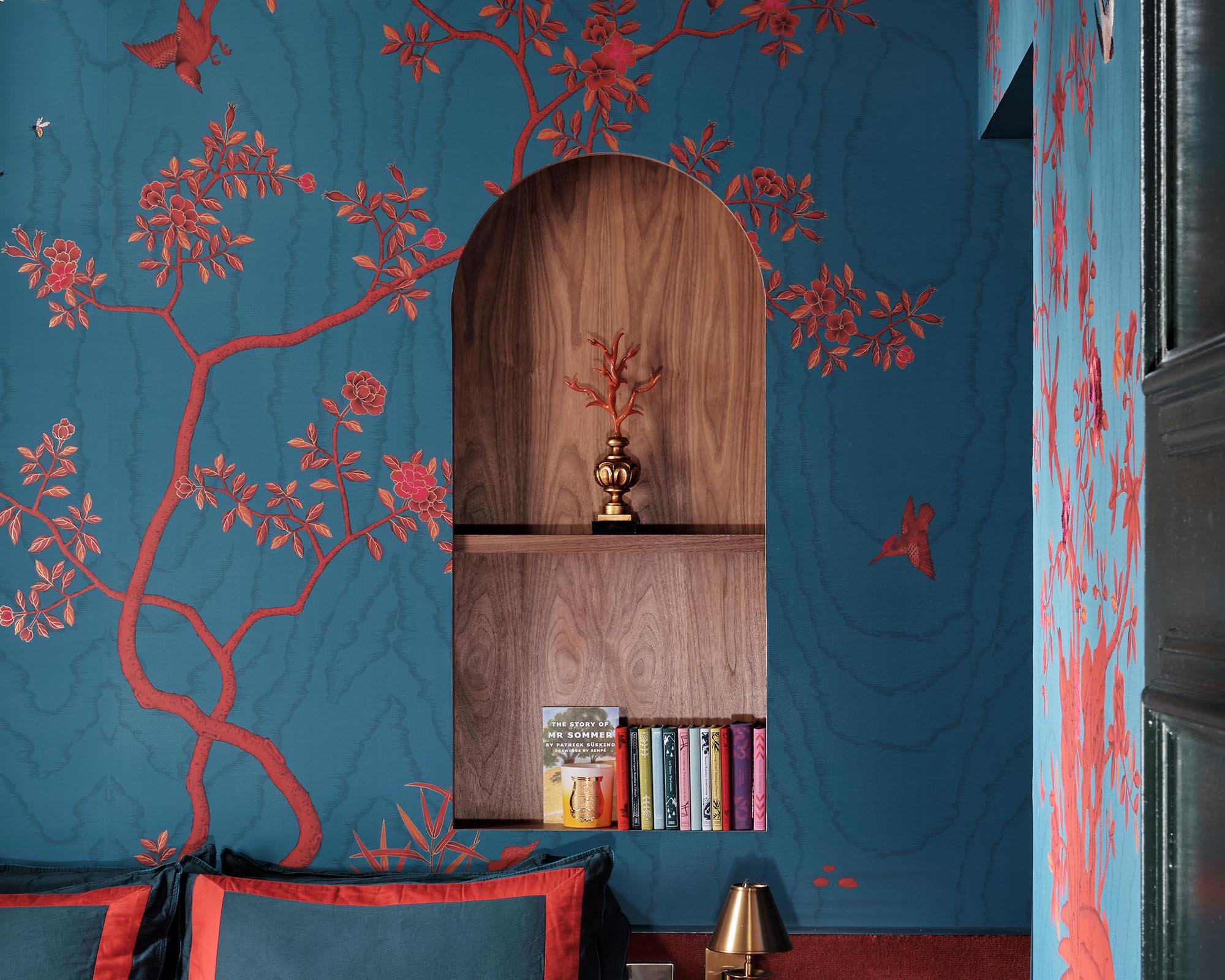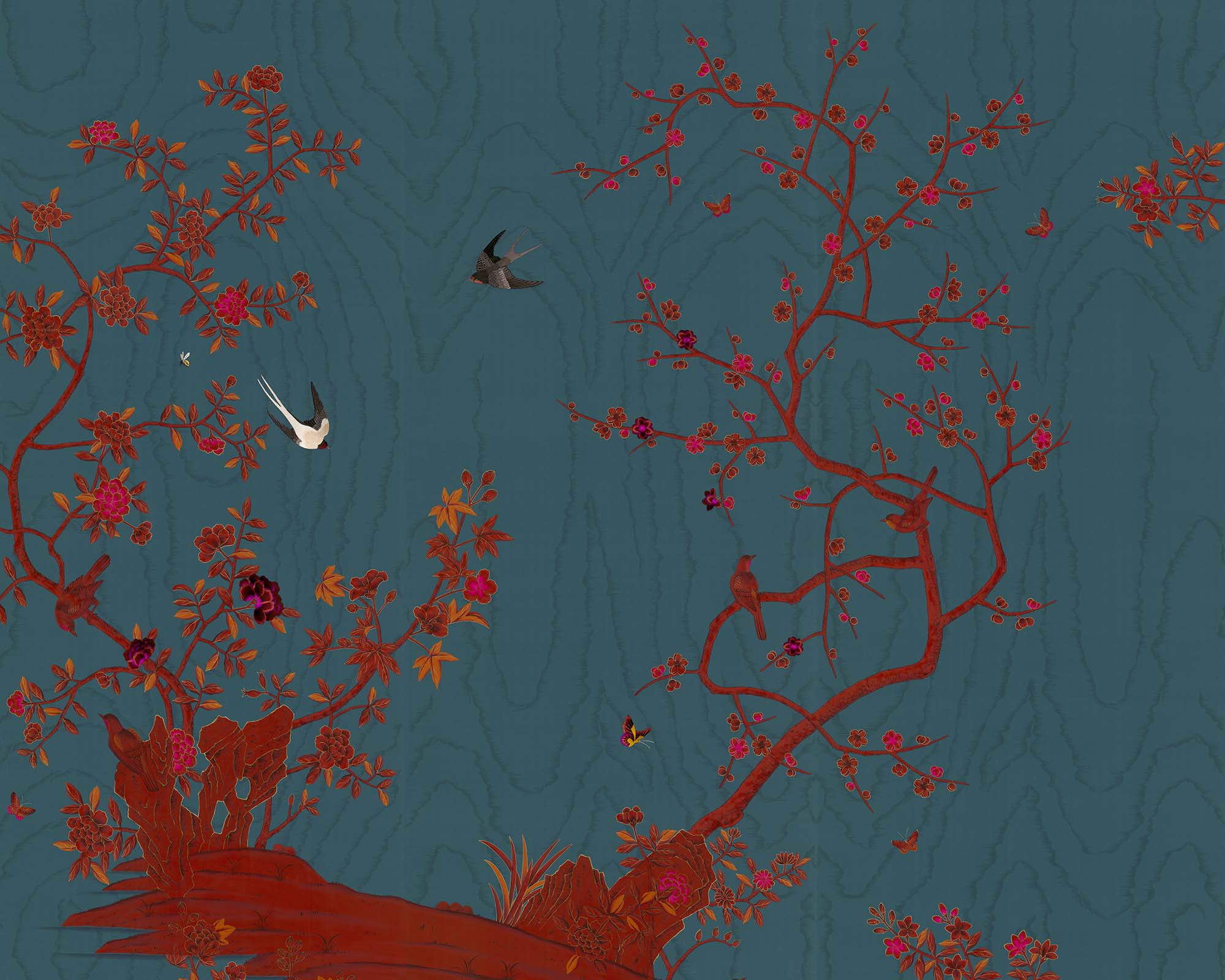 Wilde Dreams was developed in collaboration with eminent fashion designer Harris Reed, affectionately named for evoking a certain Oscar Wilde-ness. Crimson flowers and meandering branches, with pops of pink, sing out against a backdrop of kingfisher blue moiré silk.