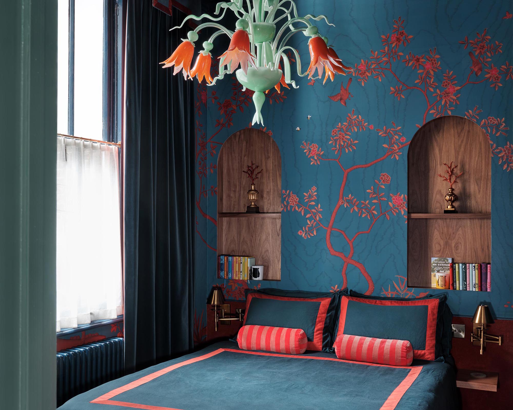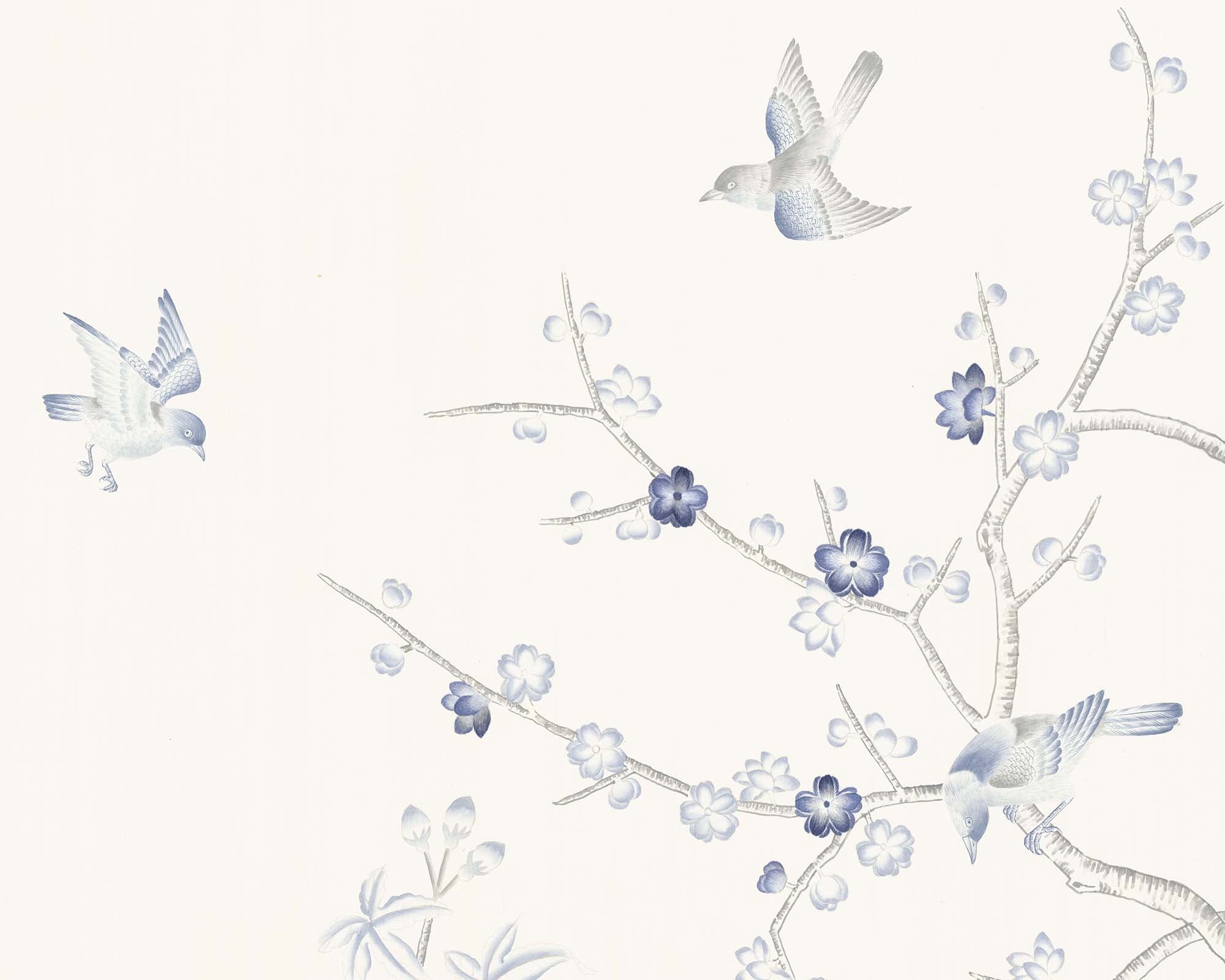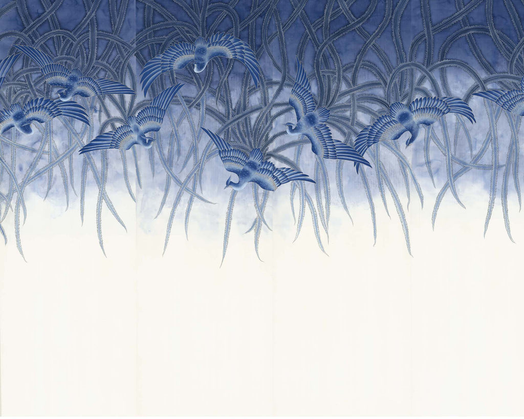 Wilde Dreams was developed in collaboration with eminent fashion designer Harris Reed, affectionately named for evoking a certain Oscar Wilde-ness. Crimson flowers and meandering branches, with pops of pink, sing out against a backdrop of kingfisher blue moiré silk.